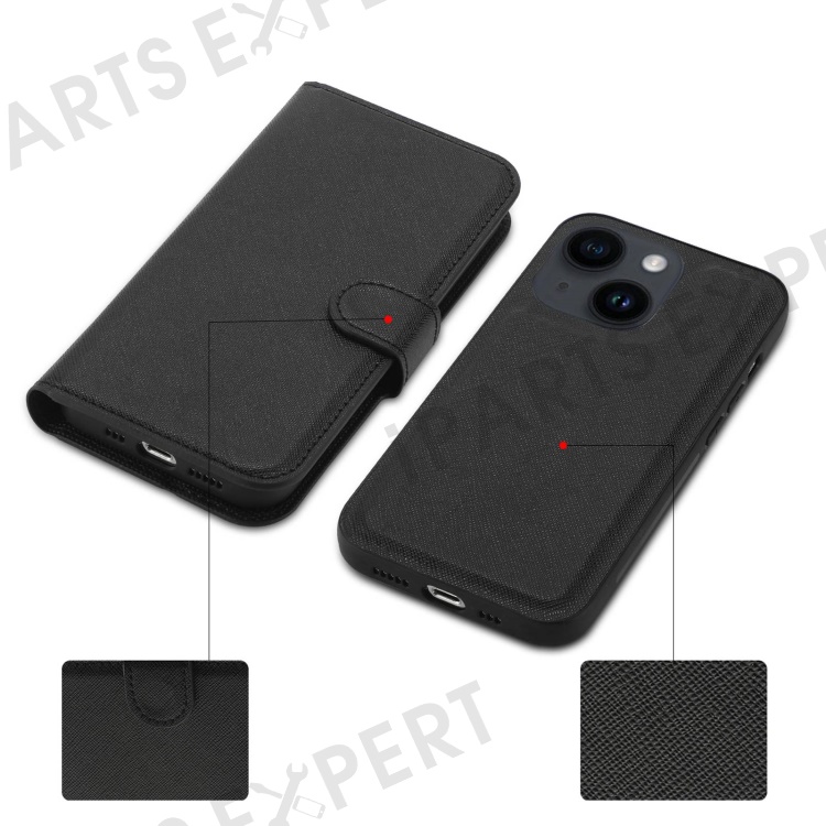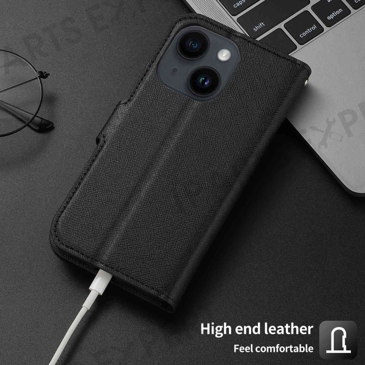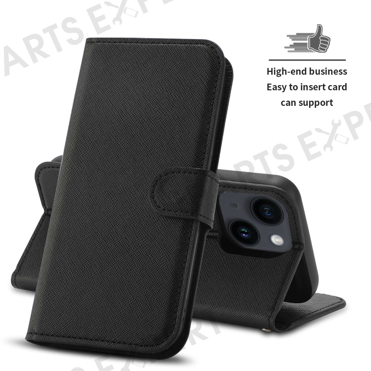 For iPhone 14 Plus Detachable TPU Back Case Cross Texture Wallet Stand PU Leather Shockproof Cover - Black
