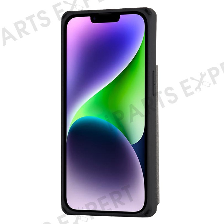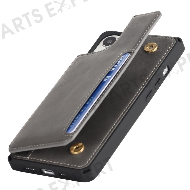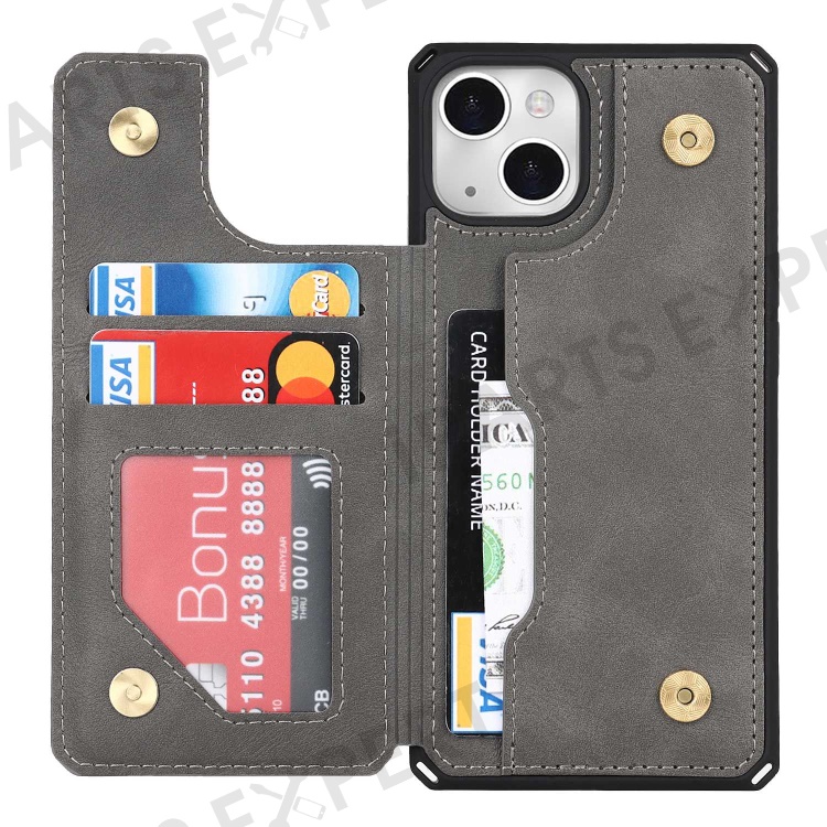 For iPhone 14 Plus Kickstand Function Magnetic Snap Button Phone Cover Shell Anti-scratch PU Leather+TPU Phone Case with Card Slot and Strap - Grey