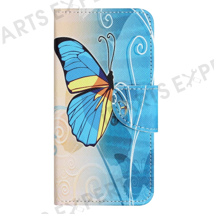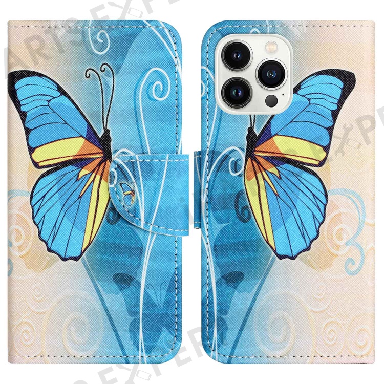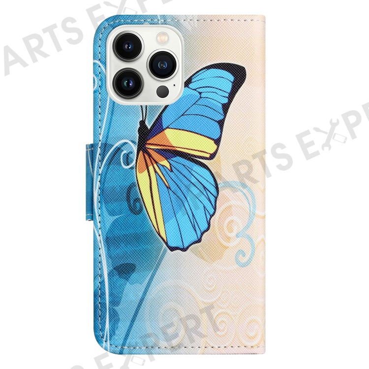 For iPhone 14 Pro 6.1 inch PU Leather+TPU Pattern Printing Phone Case Cross Texture Anti-drop Wallet Flip Shell with Stand - Blue Butterfly