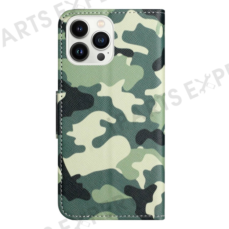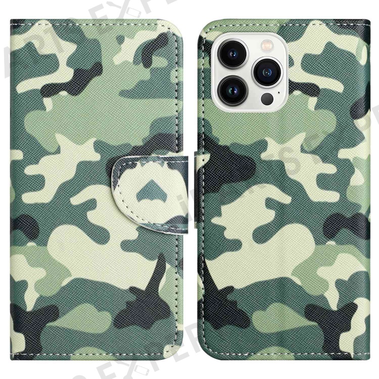 For iPhone 14 Pro 6.1 inch PU Leather+TPU Pattern Printing Phone Case Cross Texture Anti-drop Wallet Flip Shell with Stand - Camouflage