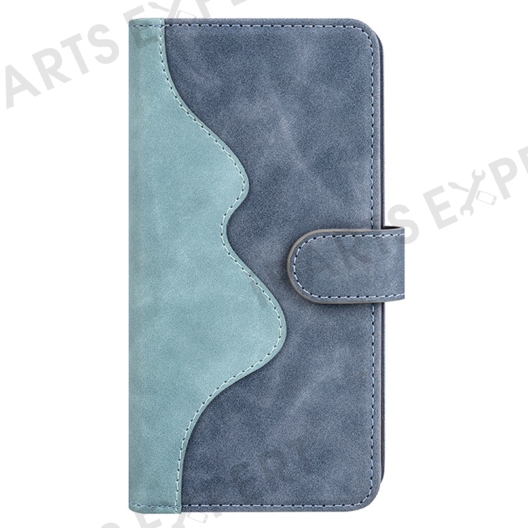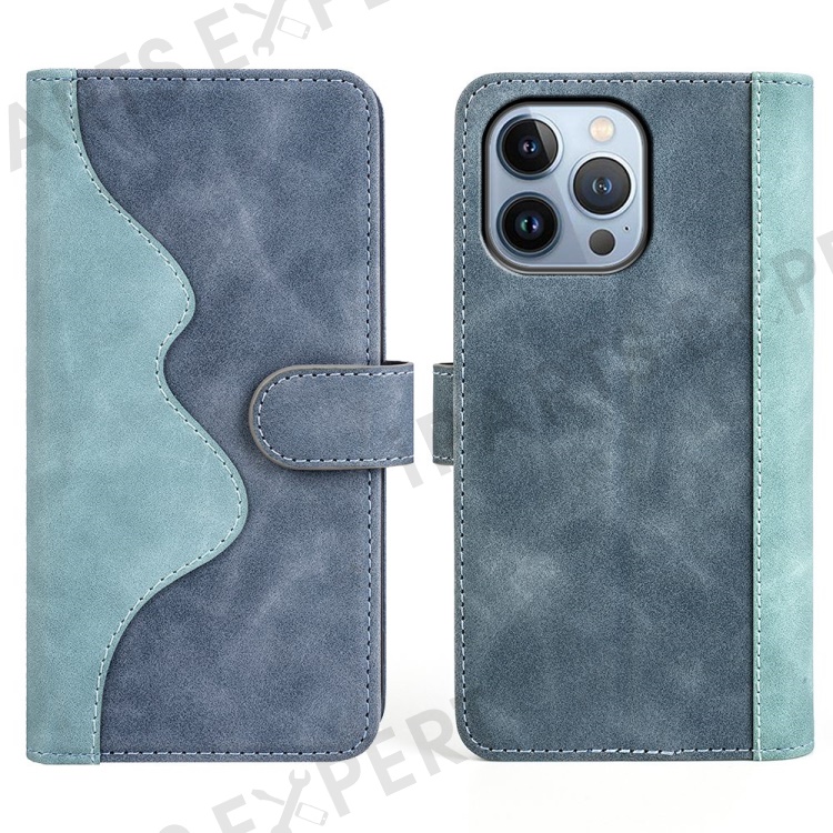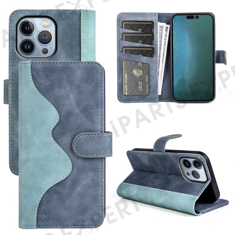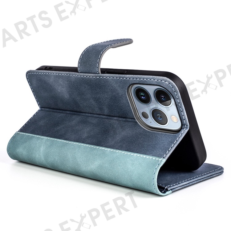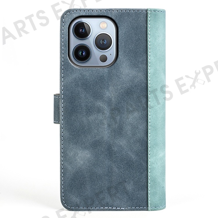 For iPhone 14 Pro 6.1 inch Splicing Design Protective Case Drop Resistant PU Leather Wallet Stand Phone Shell - Blue