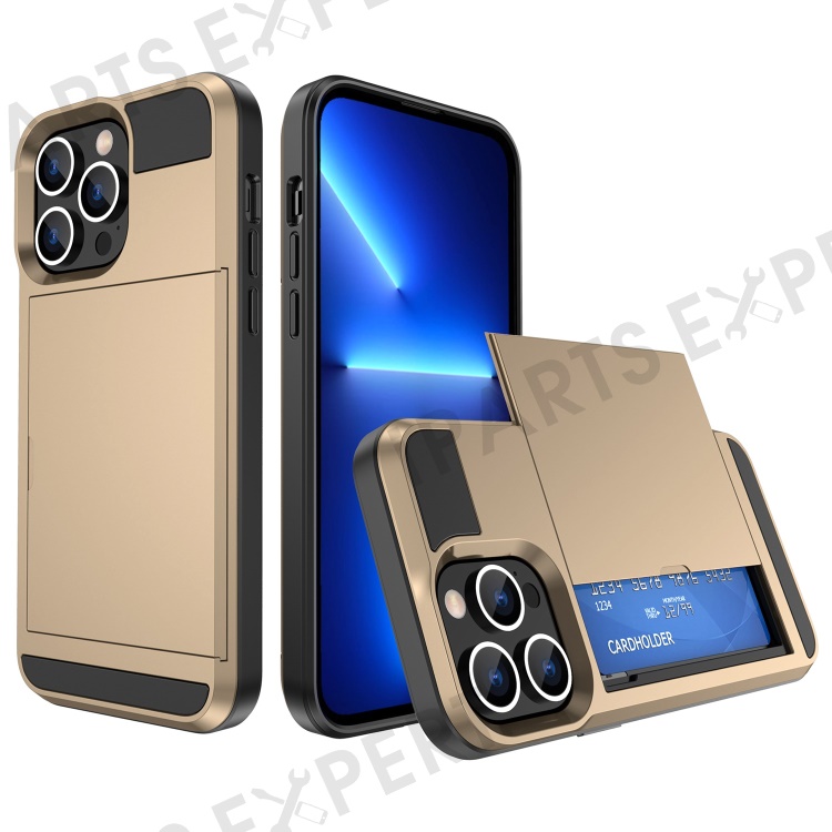 For iPhone 14 Pro Max 6.7 inch Anti-drop Phone Case with Sliding Cover Design Card Holder PC + TPU Hybrid Phone Shell - Gold