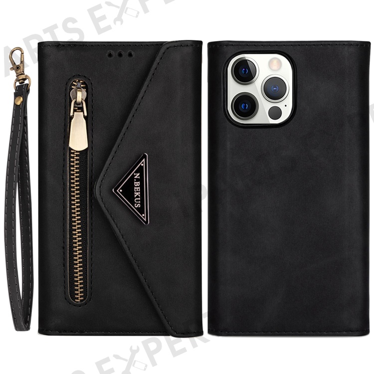For iPhone 14 Pro Max 6.7 inch Shock Absorption Phone Case PU Leather Skin-touch Feeling Zipper Wallet Stand Cover with Short + Long Strap - Black