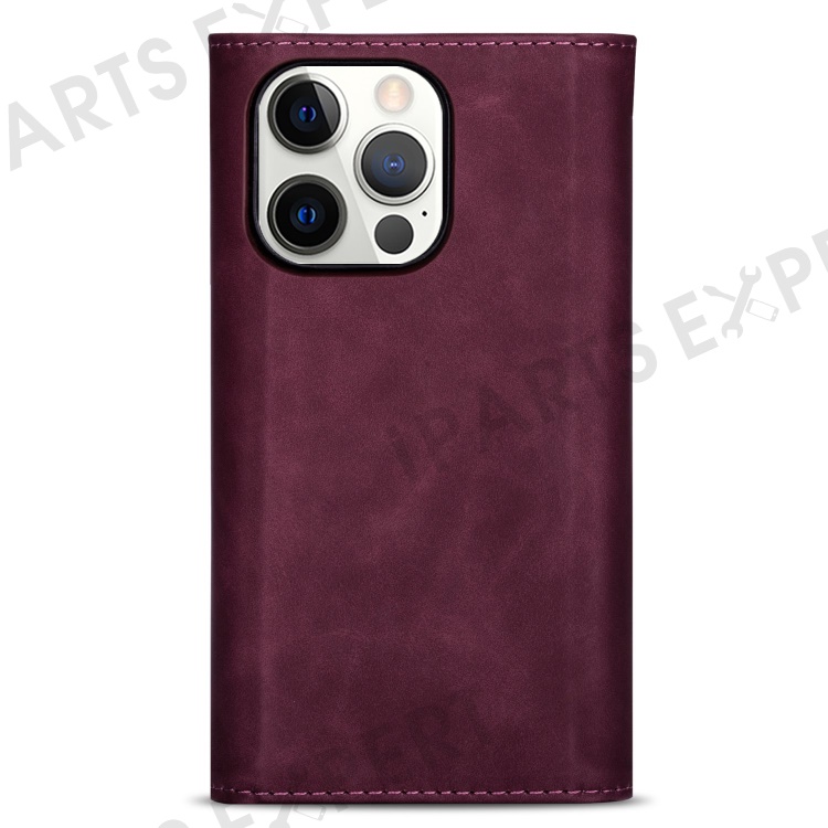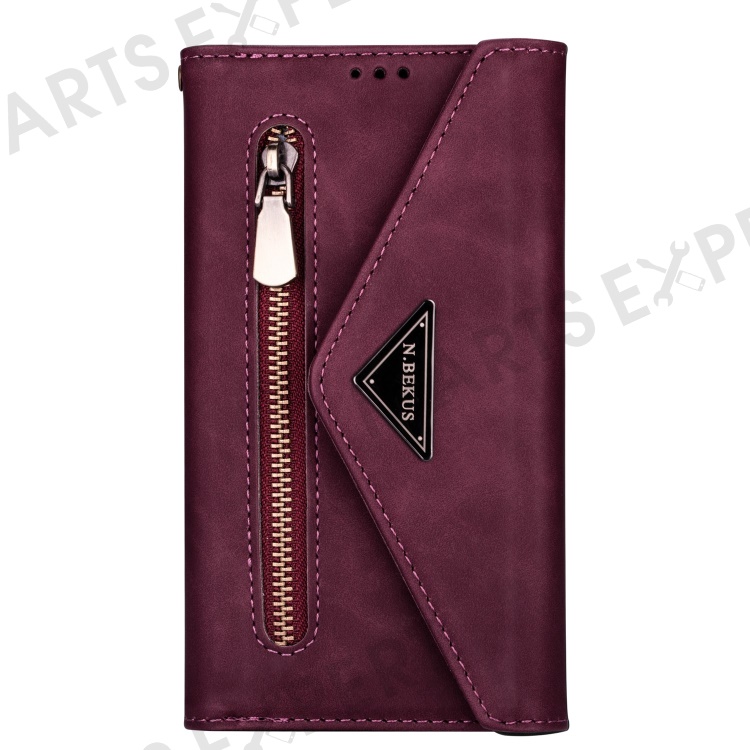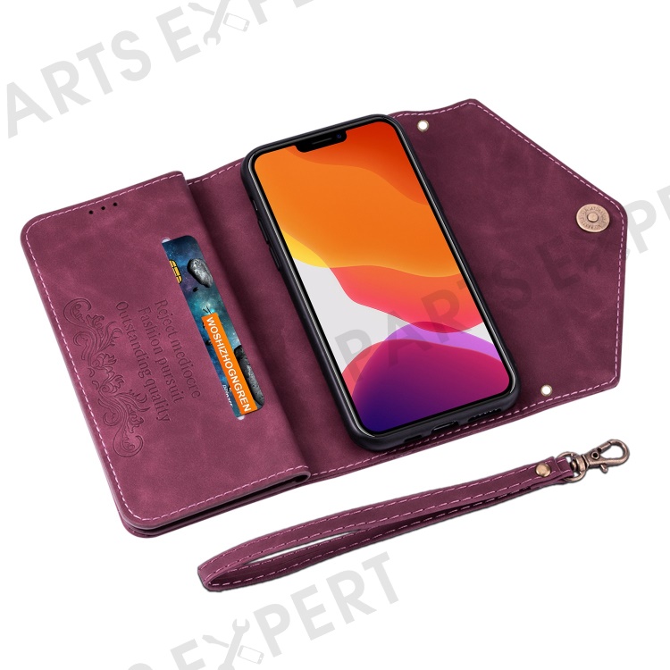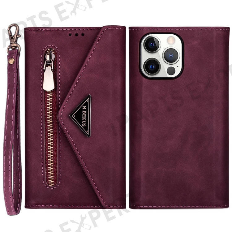 For iPhone 14 Pro Max 6.7 inch Shock Absorption Phone Case PU Leather Skin-touch Feeling Zipper Wallet Stand Cover with Short + Long Strap - Wine Red