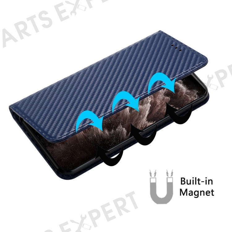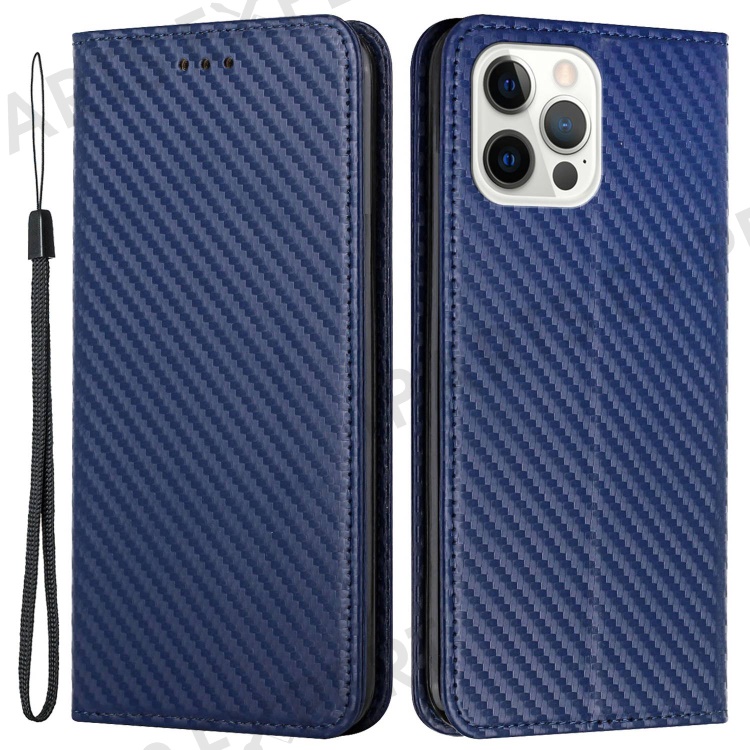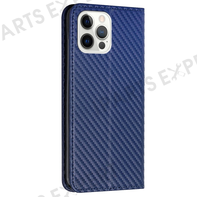 For iPhone 14 Pro Max 6.7 inch Well-protected Carbon Fiber Texture PU Leather Case Auto Magnetic Closed Flip Stand Wallet Cover - Blue