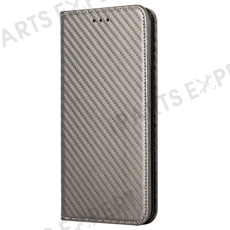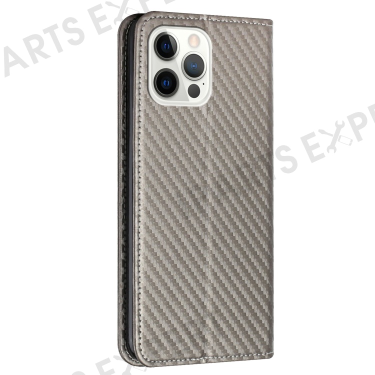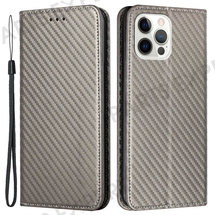 For iPhone 14 Pro Max 6.7 inch Well-protected Carbon Fiber Texture PU Leather Case Auto Magnetic Closed Flip Stand Wallet Cover - Grey