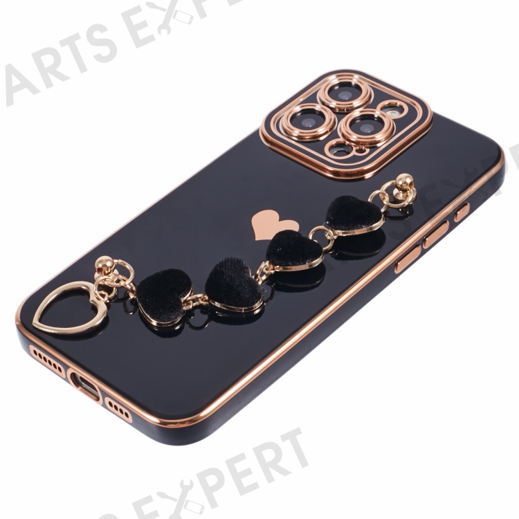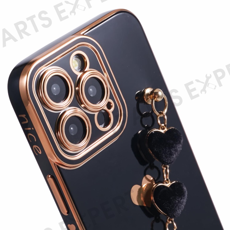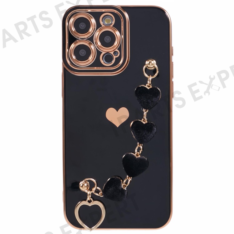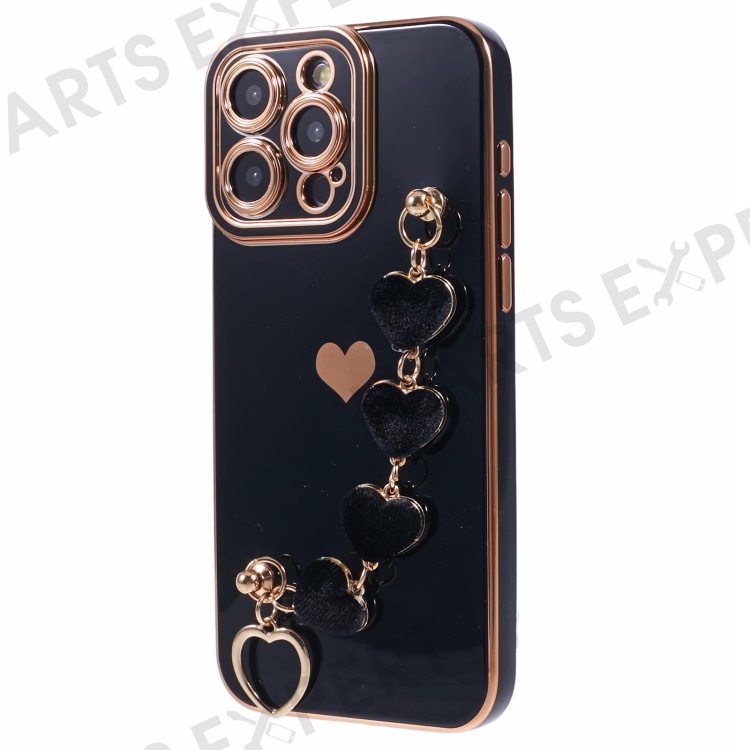 For iPhone 14 Pro Max Electroplating Phone Case Soft TPU Back Cover with Plush Love-Heart Strap - Black