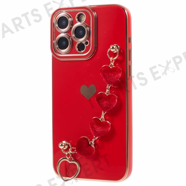 For iPhone 14 Pro Max Electroplating Phone Case Soft TPU Back Cover with Plush Love-Heart Strap - Red