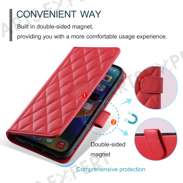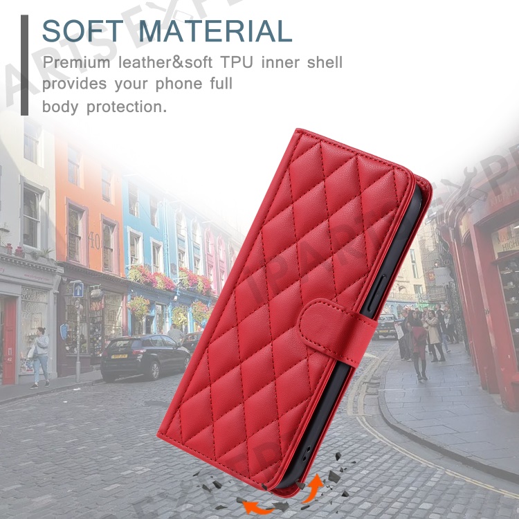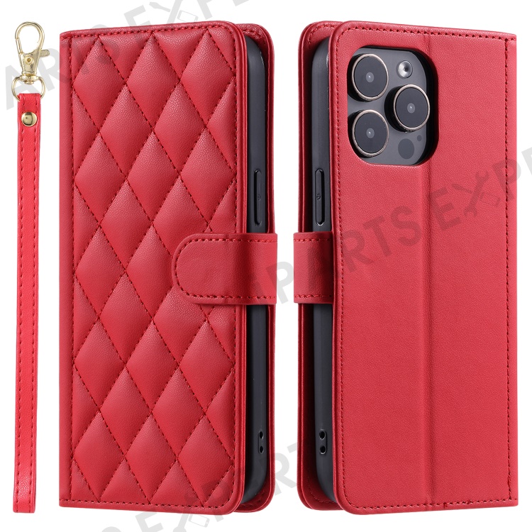 For iPhone 14 Pro Max Leather Phone Case with Wallet Rhombus Grid Pattern - Red
