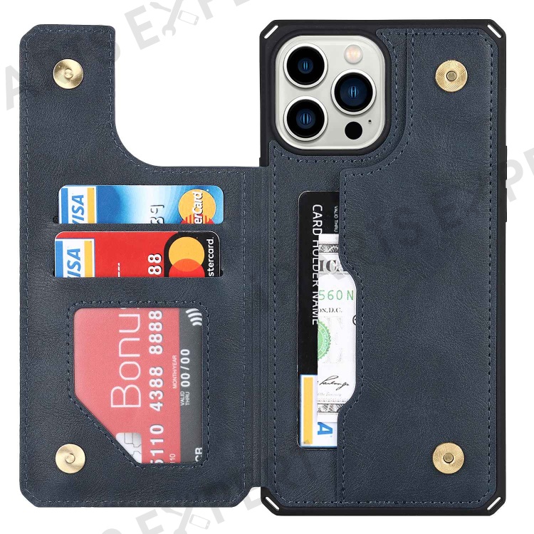 For iPhone 14 Pro Max Multiple Card Slots Kickstand Design Anti-scratch PU Leather+TPU Phone Case Magnetic Snap Button Phone Cover Shell - Blue