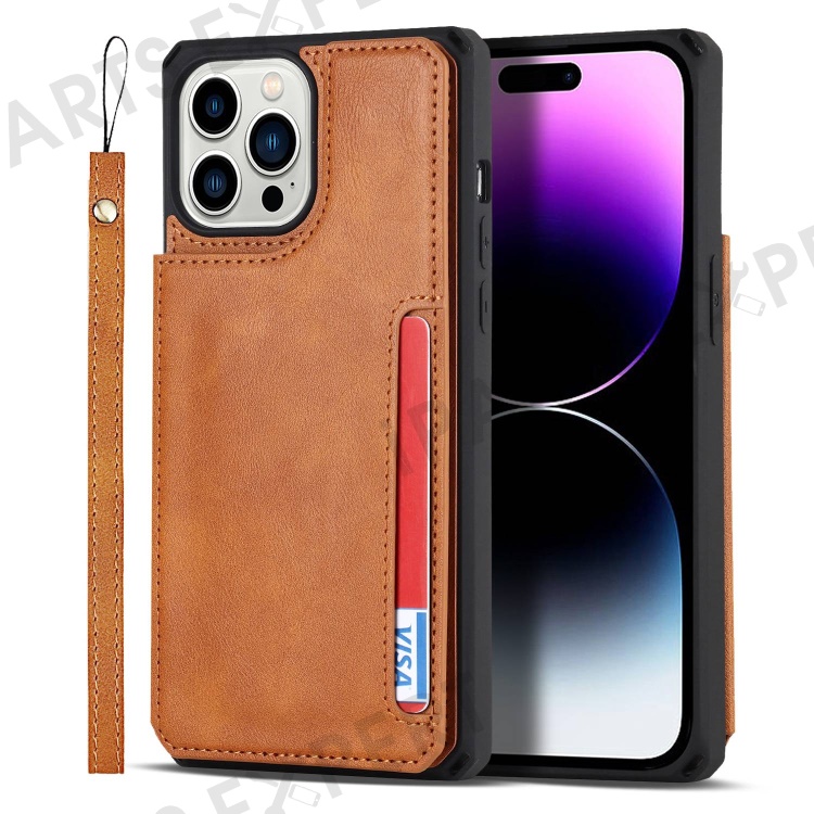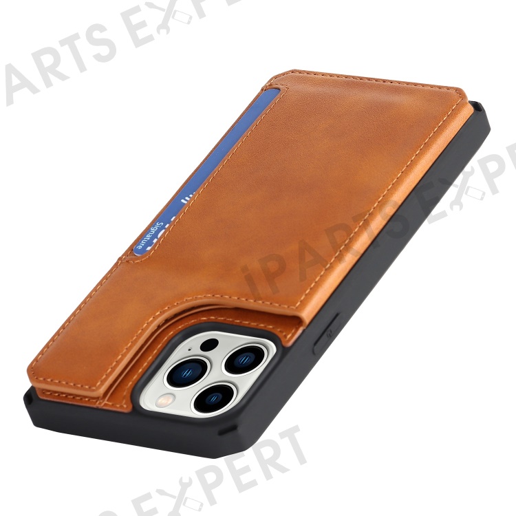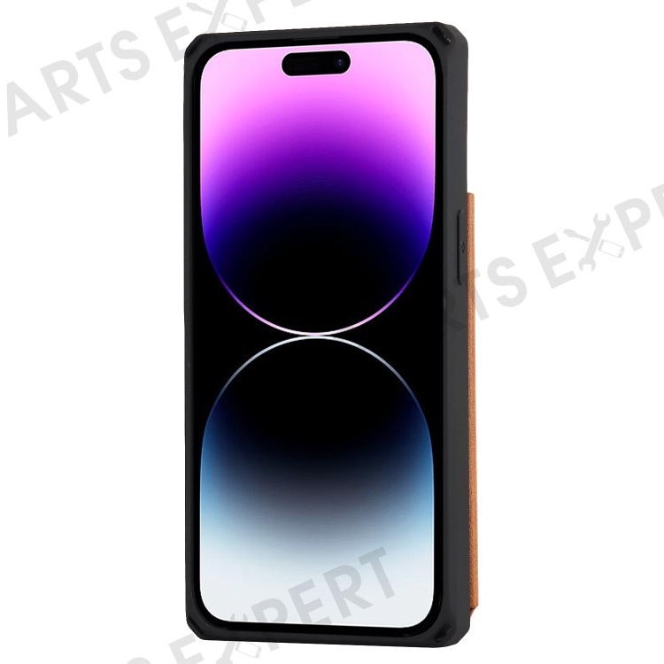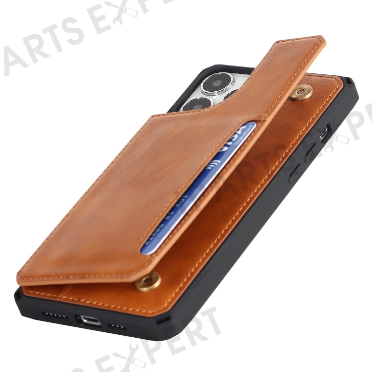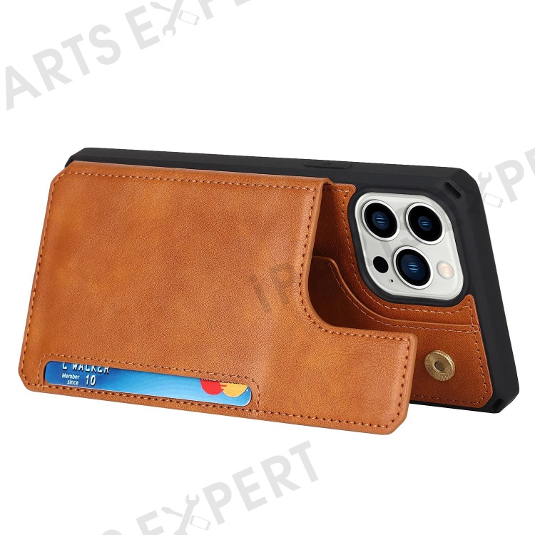 For iPhone 14 Pro Max Multiple Card Slots Kickstand Design Anti-scratch PU Leather+TPU Phone Case Magnetic Snap Button Phone Cover Shell - Light Brown
