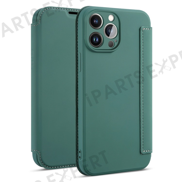 For iPhone 14 Pro Skin-touch Liquid Silicone Protective Case Card Holder Kickstand Phone Shockproof Cover - Blackish Green