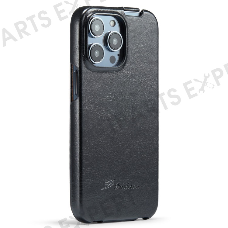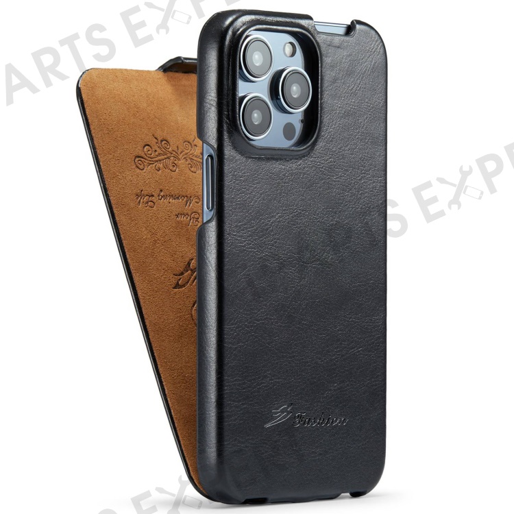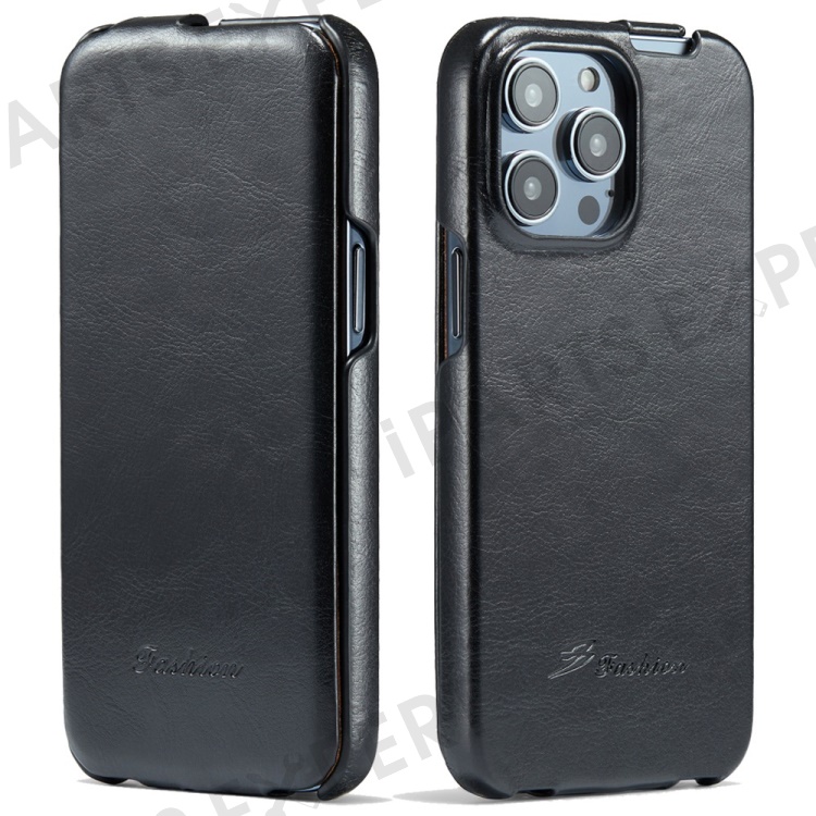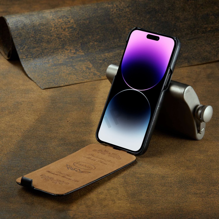 For iPhone 14 Pro Vertical Flip Down Cover Imprinted Pattern Crazy Horse Texture PU Leather Anti-Scratch Cell Phone Case - Black