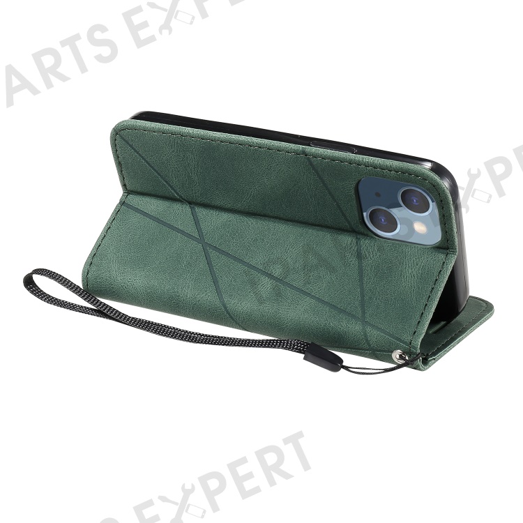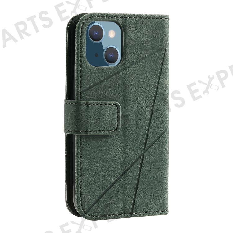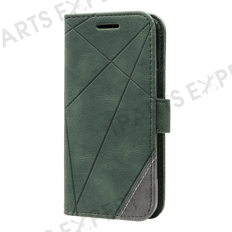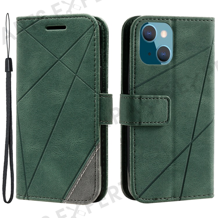 For iPhone 14 Wallet Case Splicing Leather Stand Phone Cover with Hand Strap - Green