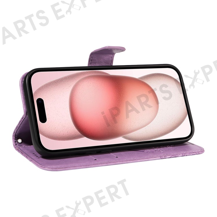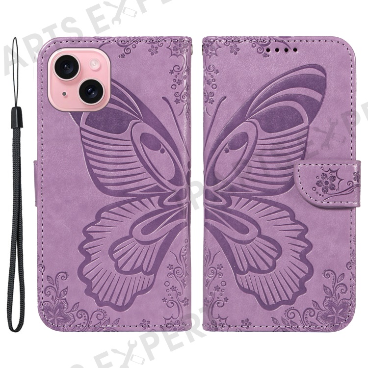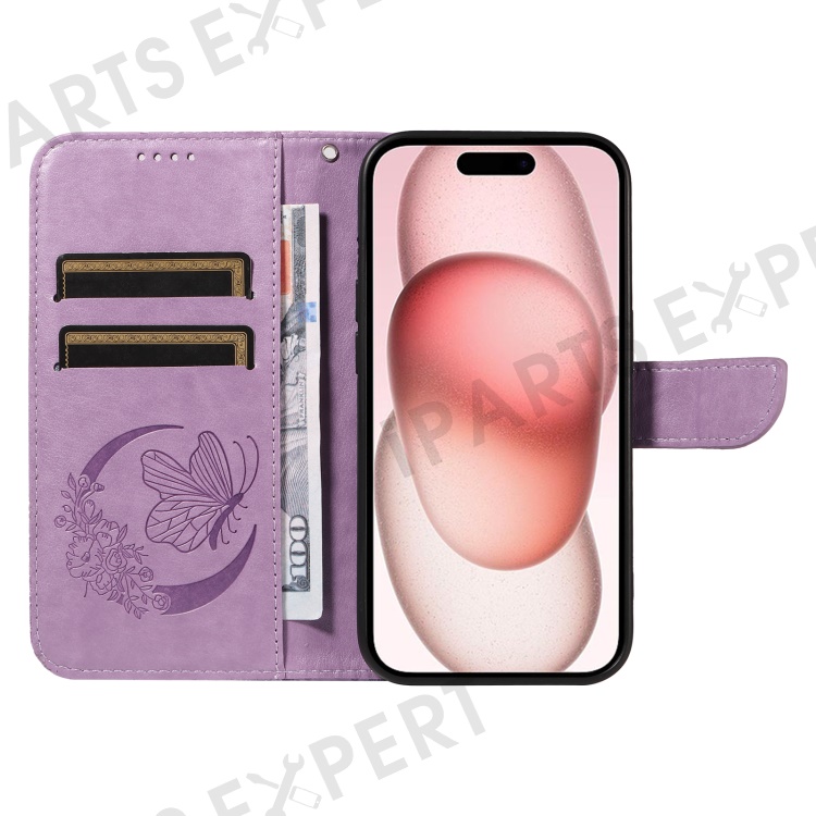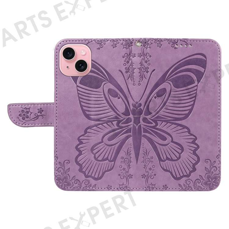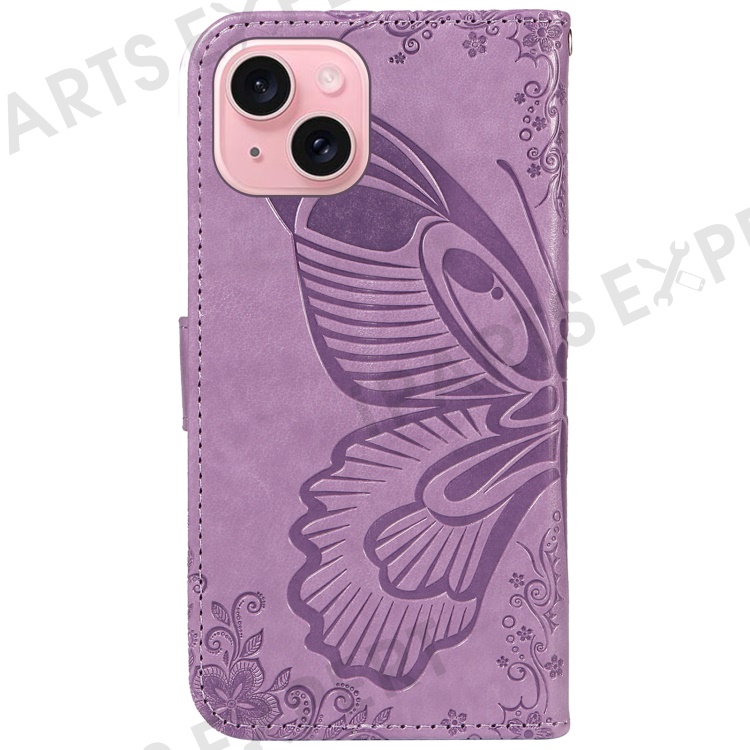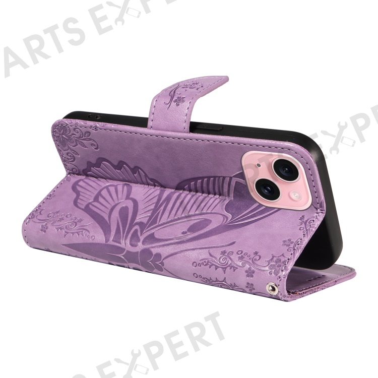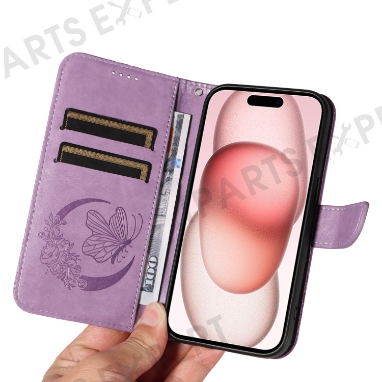 For iPhone 15 Case Leather Wallet Flip Phone Cover Butterfly Pattern - Light Purple
