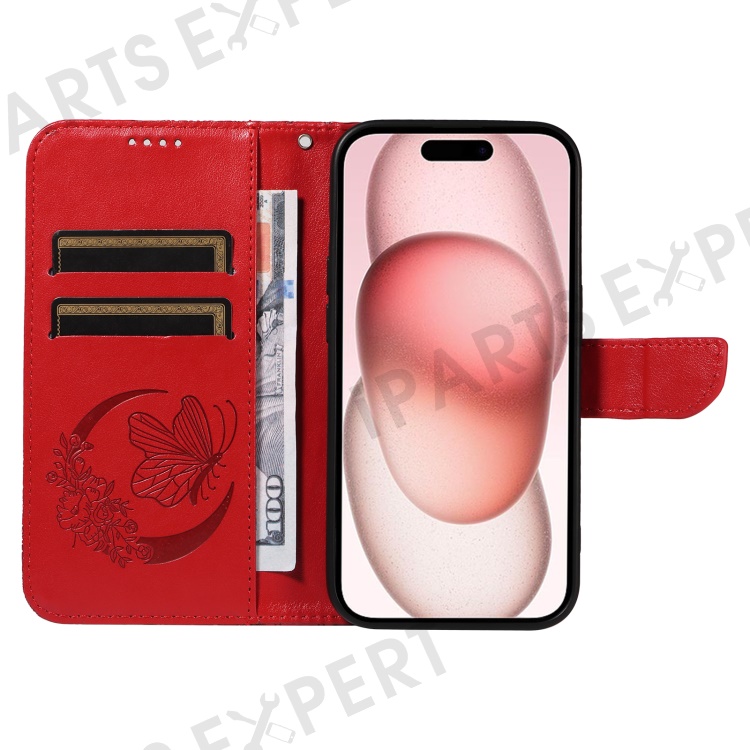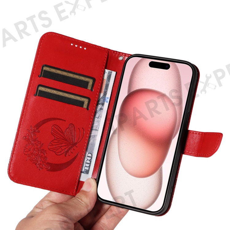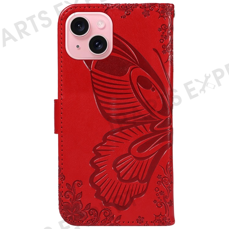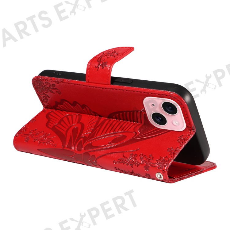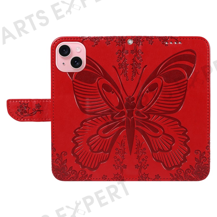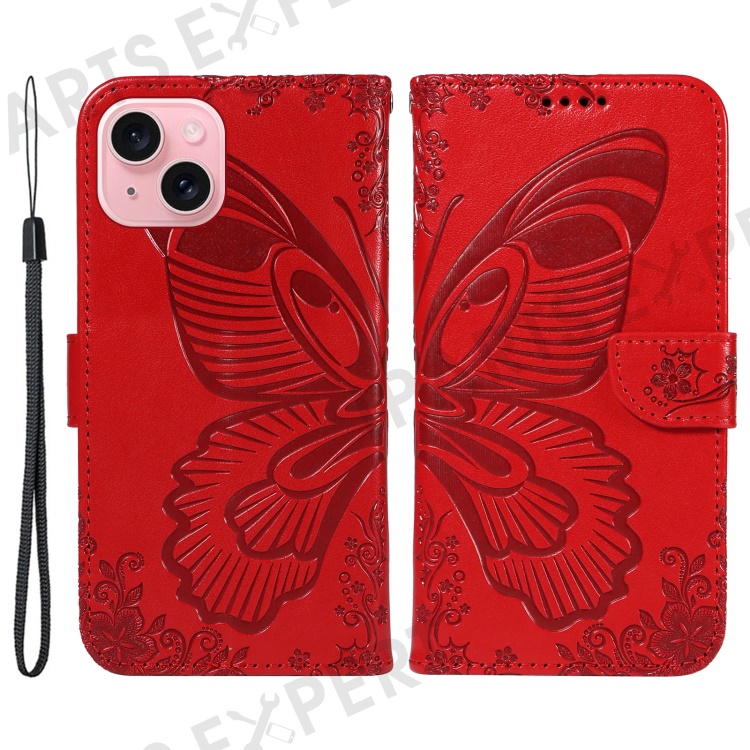 For iPhone 15 Case Leather Wallet Flip Phone Cover Butterfly Pattern - Red
