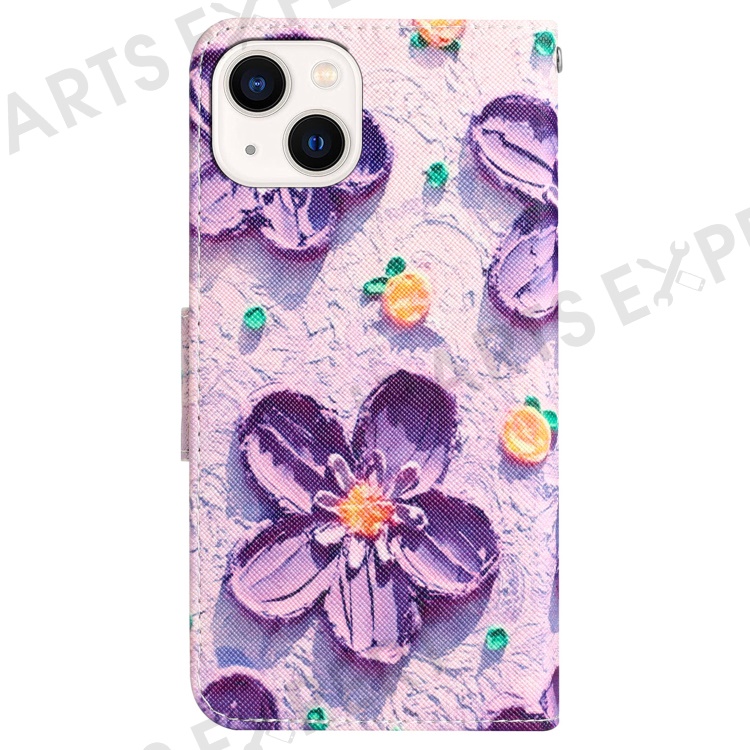 For iPhone 15 Pattern Printing Flip Wallet Case PU Leather Stand Phone Cover with Strap - Purple Flower