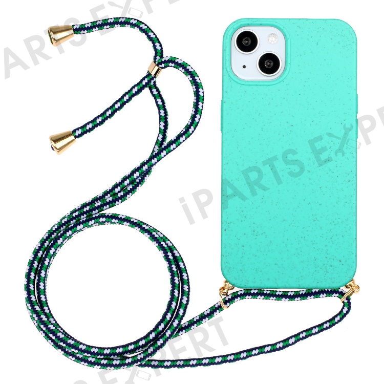 For iPhone 15 Plus Biodegradable Phone Case Wheat Straw+TPU Shockproof Protection Cover with Lanyard - Sky Blue