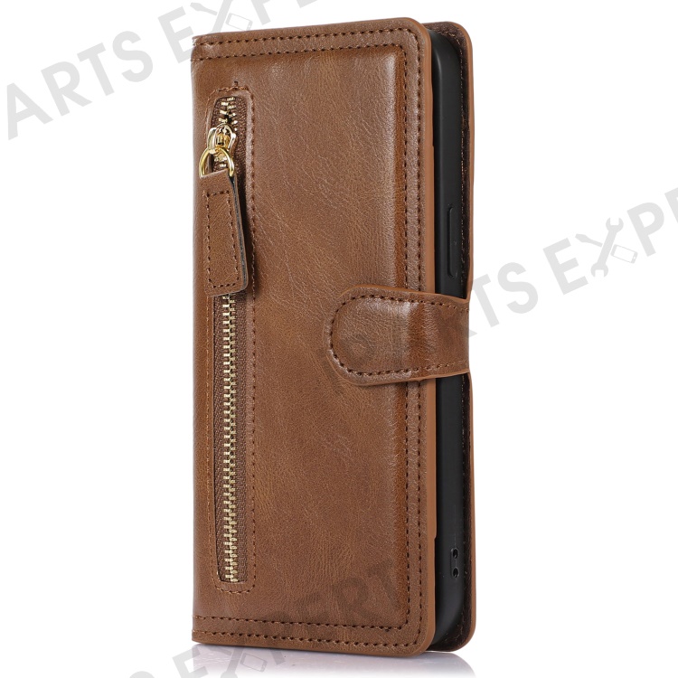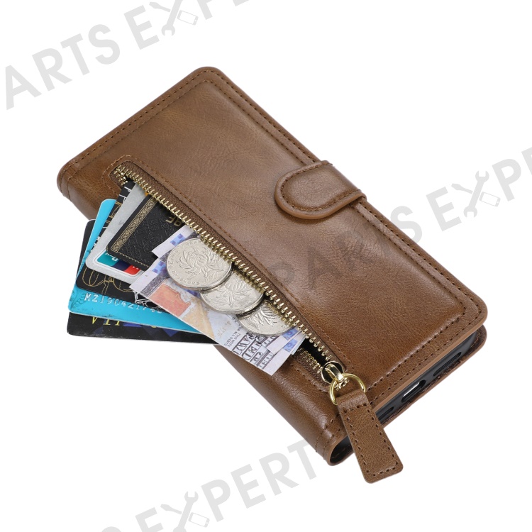 For iPhone 15 Plus Slim-Fit PU Leather Case Wallet Zipper Pocket Flip Stand Phone Cover Shell - Brown
