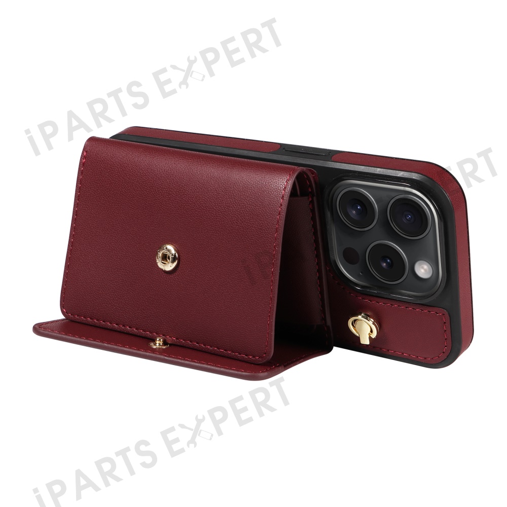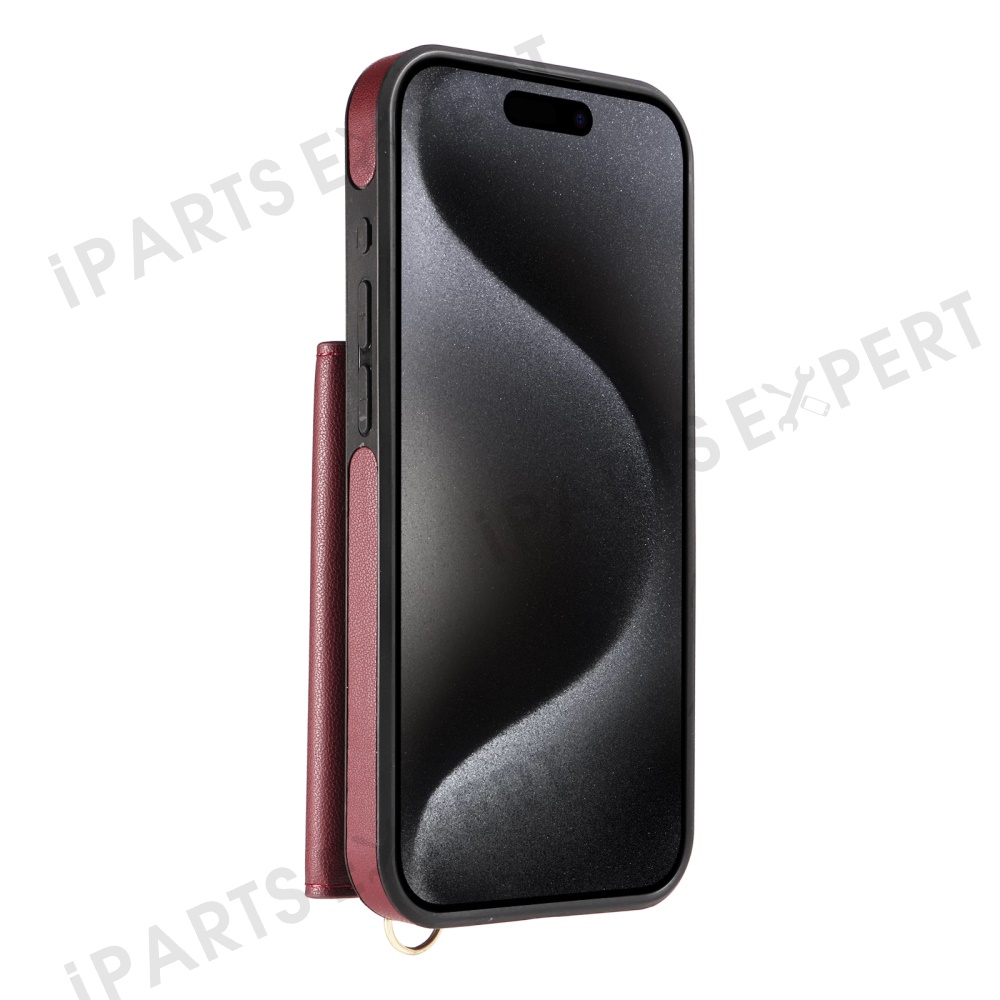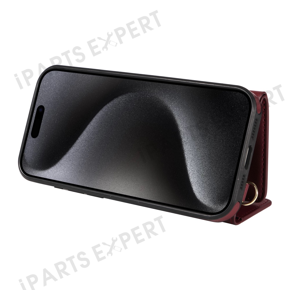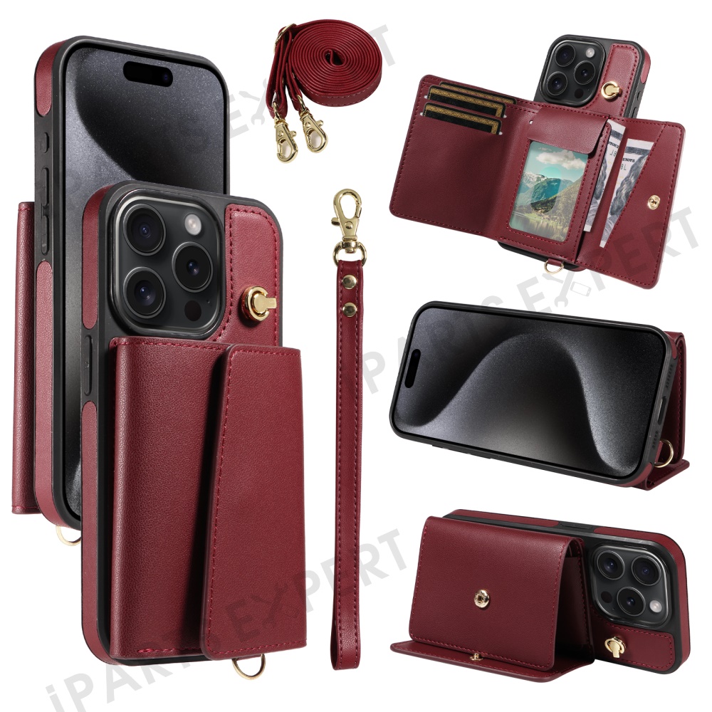 For iPhone 15 Pro Crossbody Phone Case Card Holder Kickstand Leather Coated TPU Mobile Cover - Wine Red