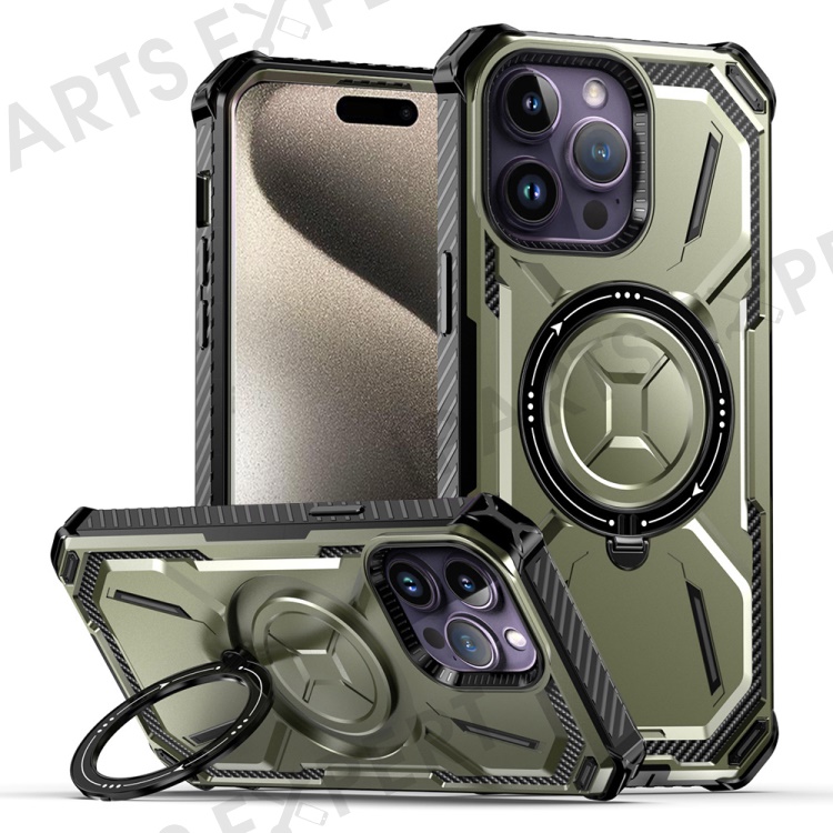 For iPhone 15 Pro Magnetic Phone Case Kickstand Shock-Absorption Cover - Army Green