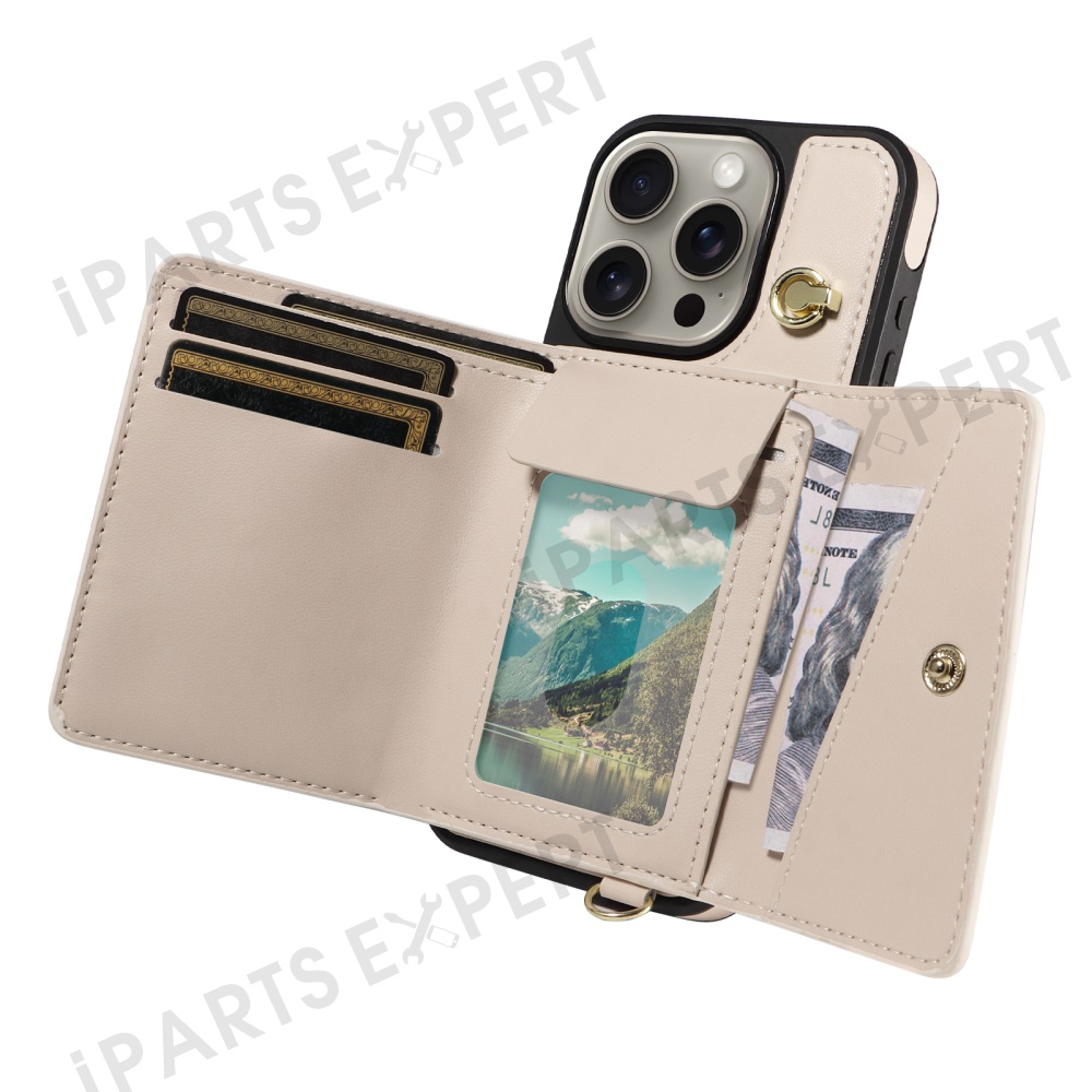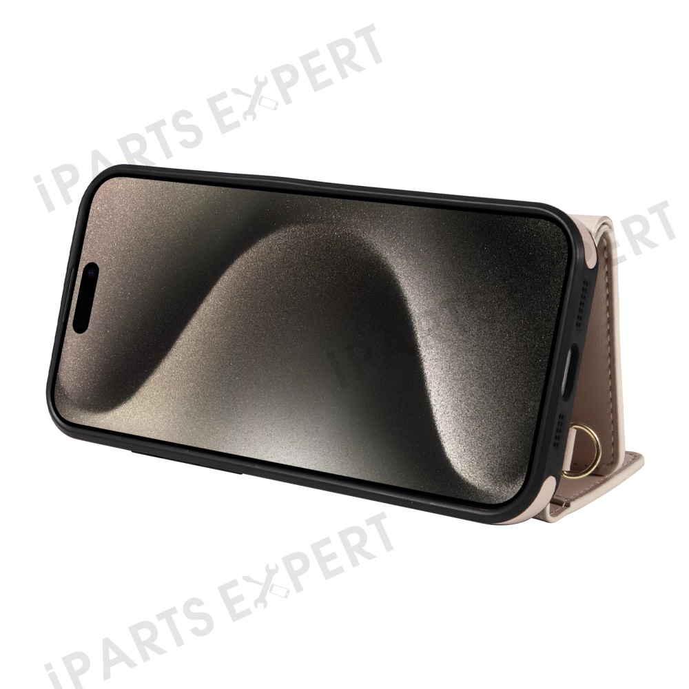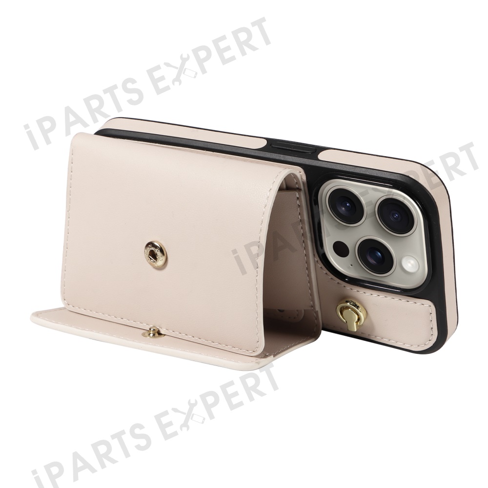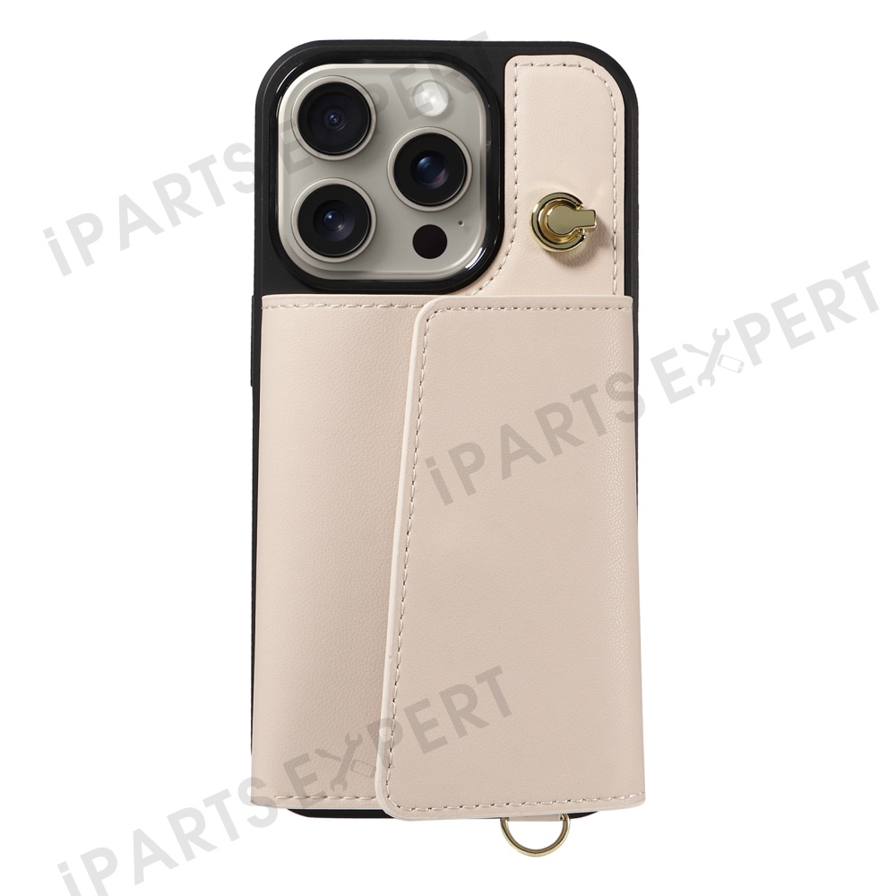 For iPhone 15 Pro Max Crossbody Phone Case Card Holder Kickstand Leather Coated TPU Mobile Cover - Beige