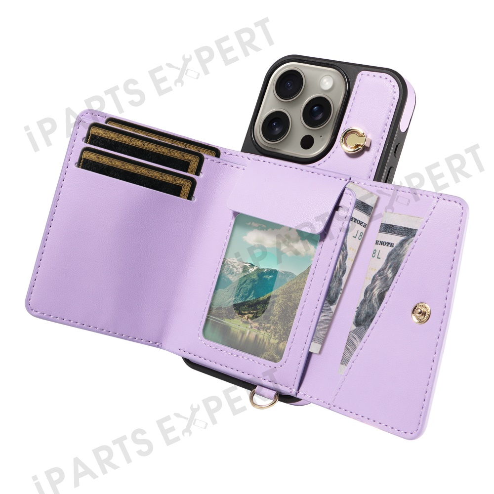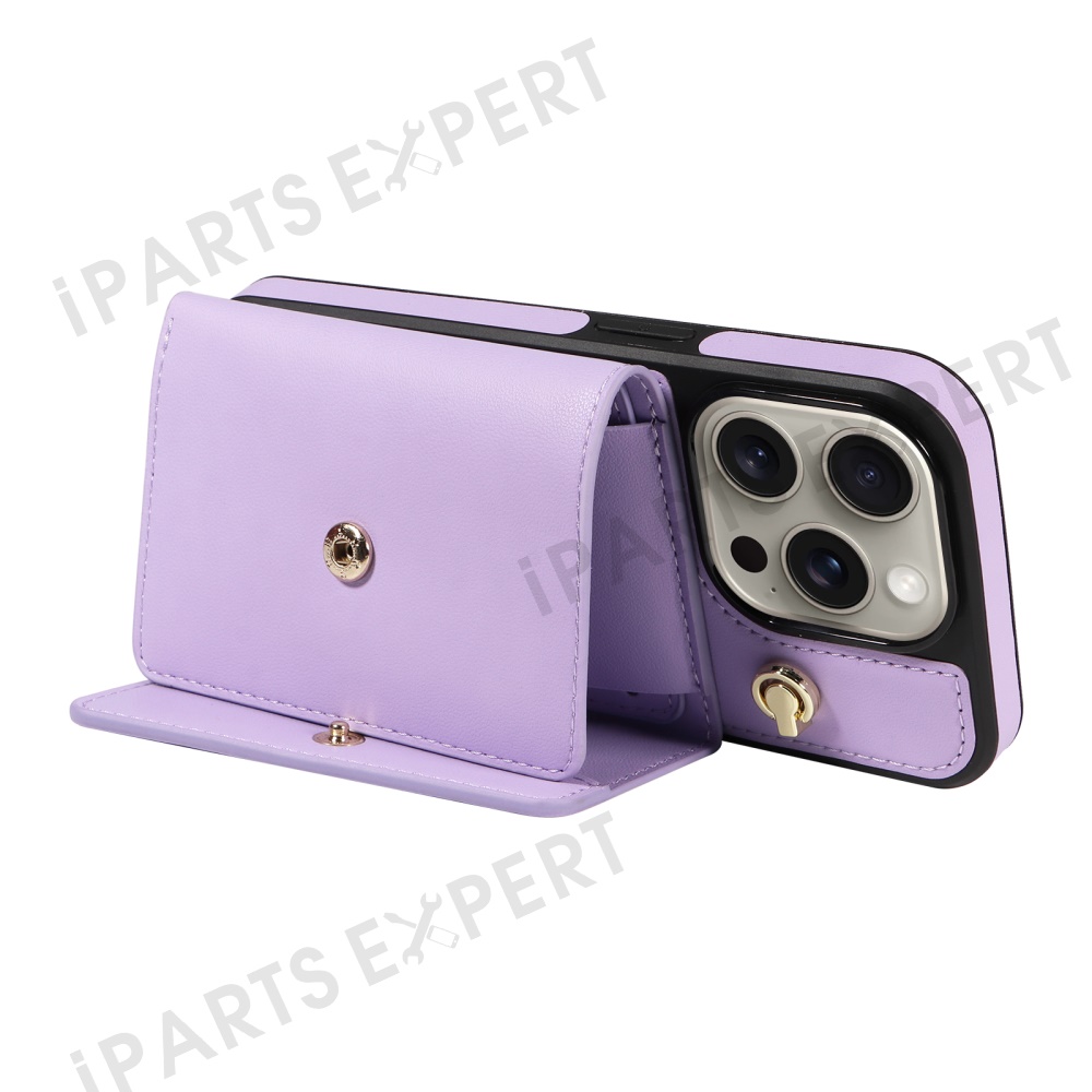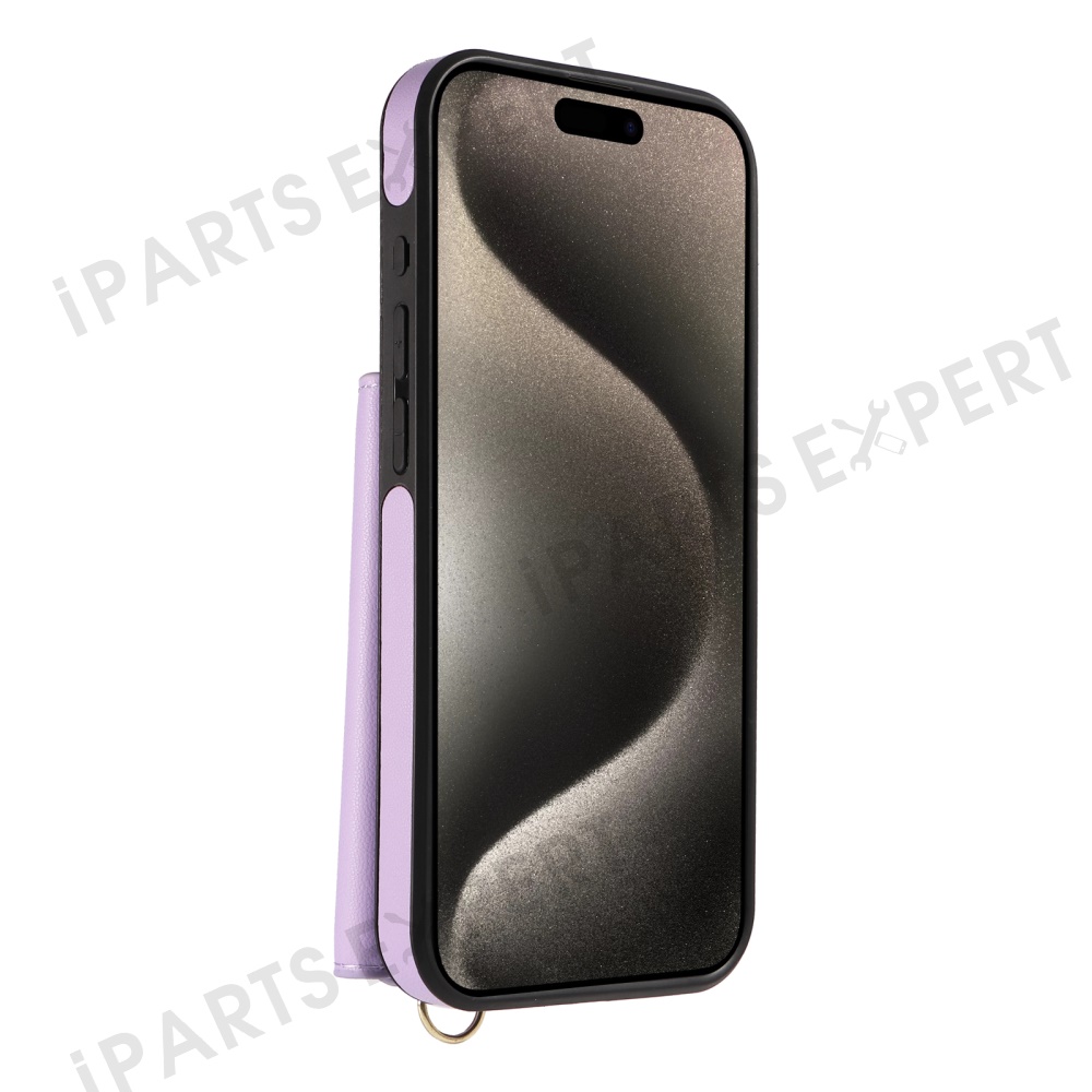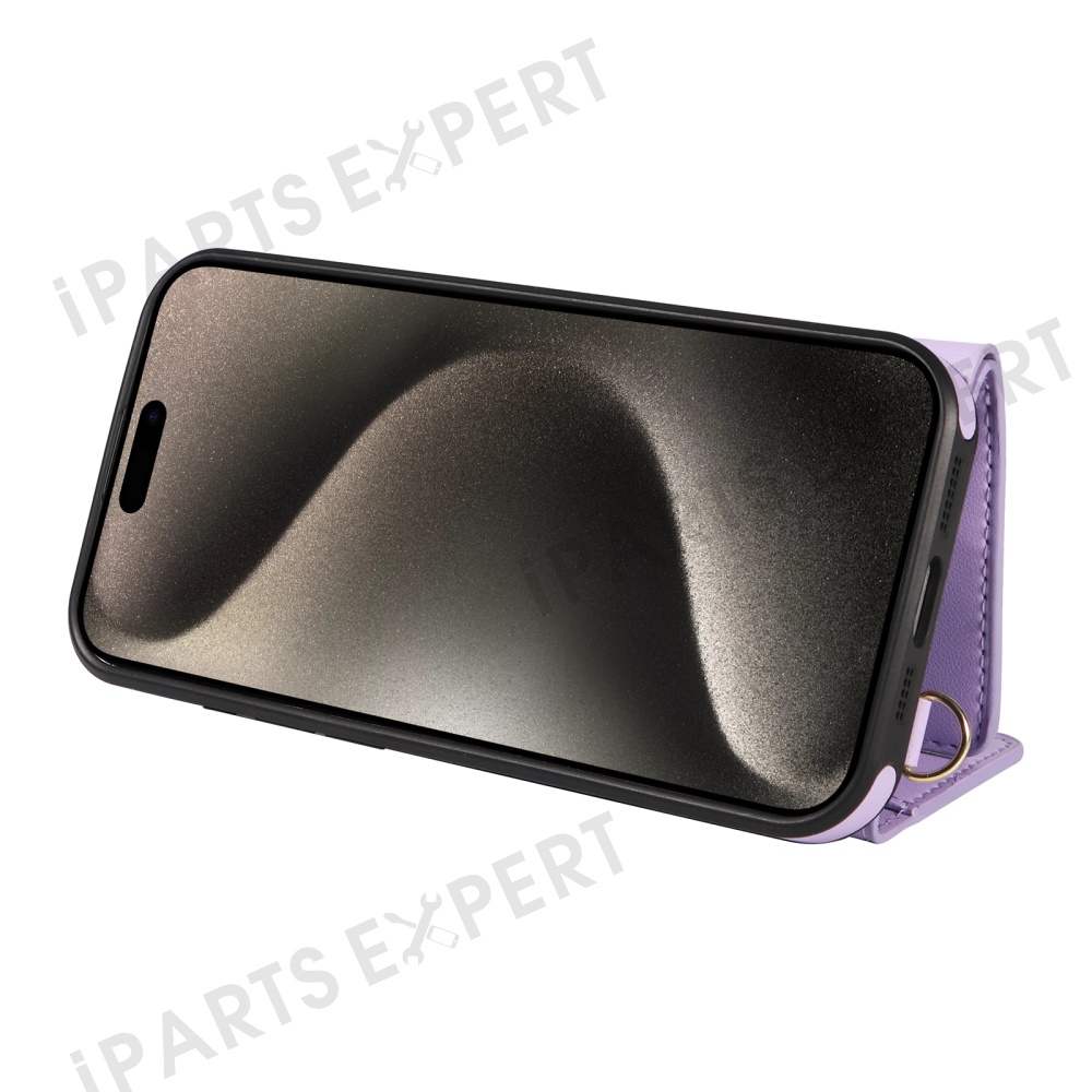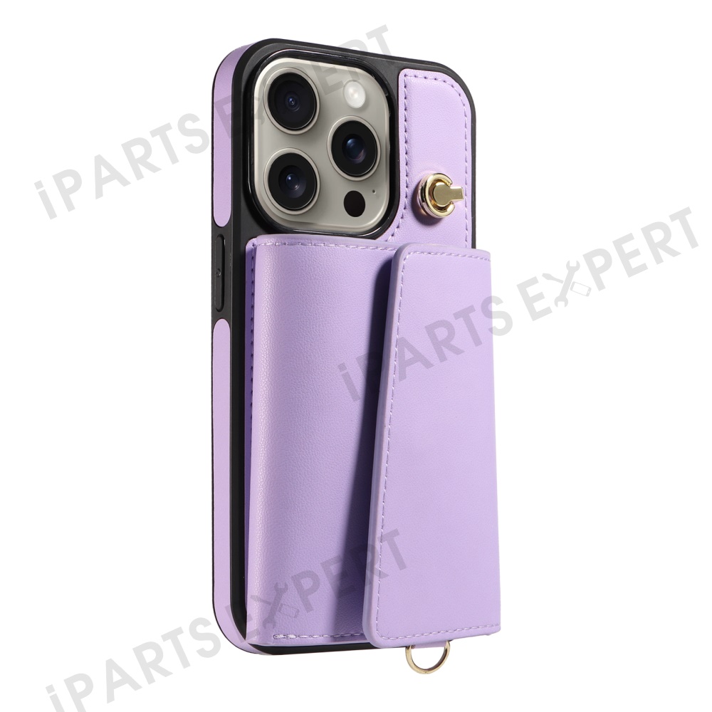For iPhone 15 Pro Max Crossbody Phone Case Card Holder Kickstand Leather Coated TPU Mobile Cover - Purple