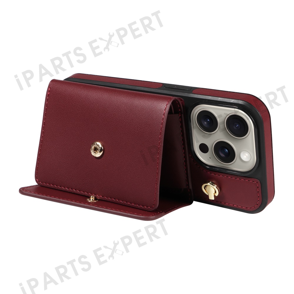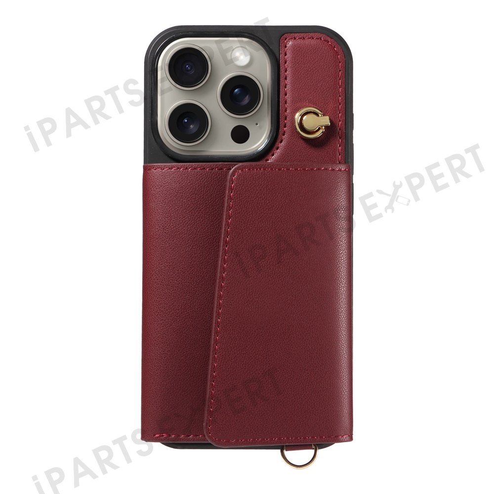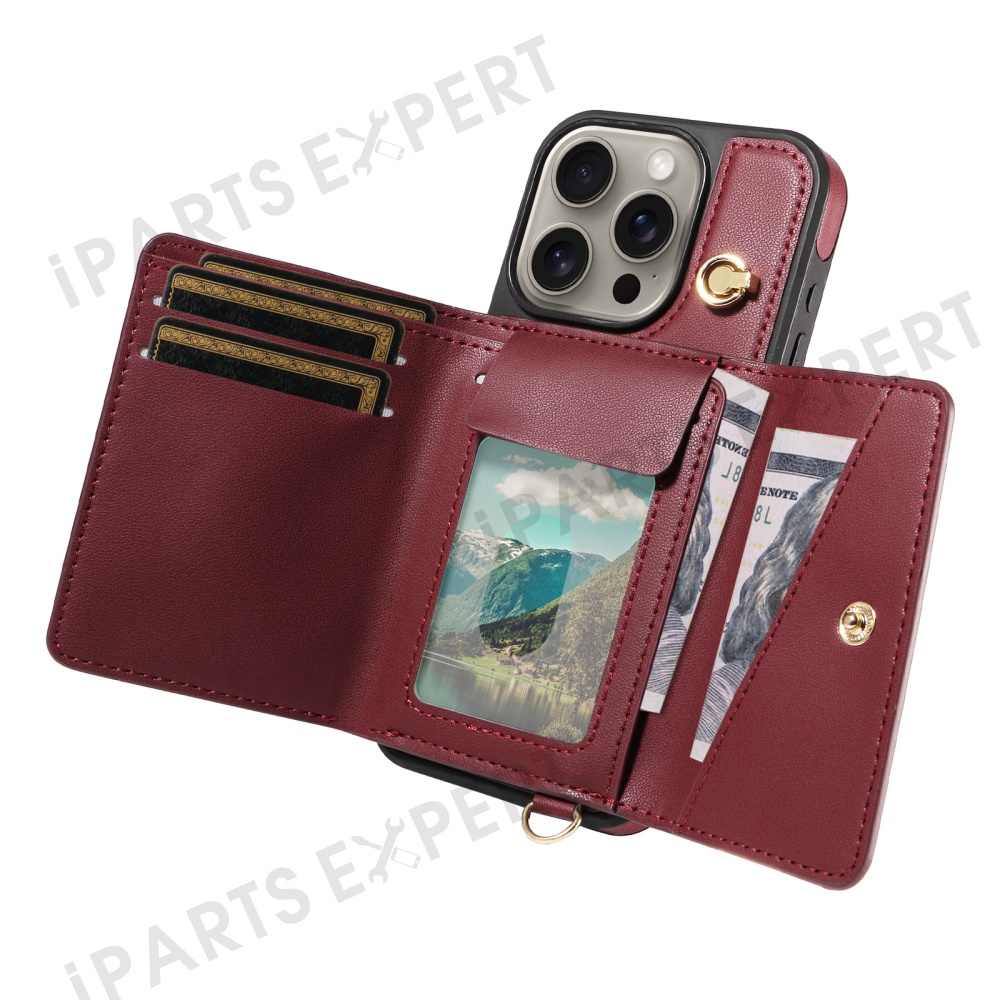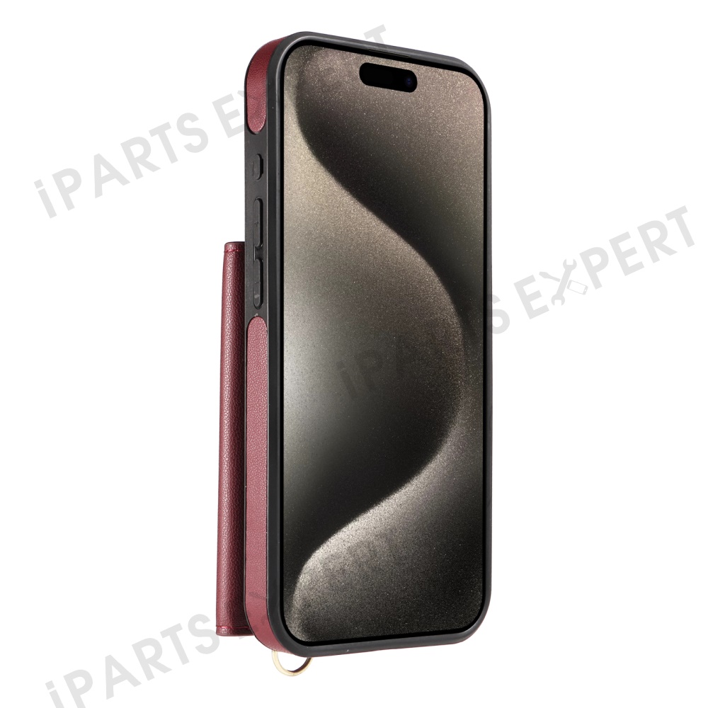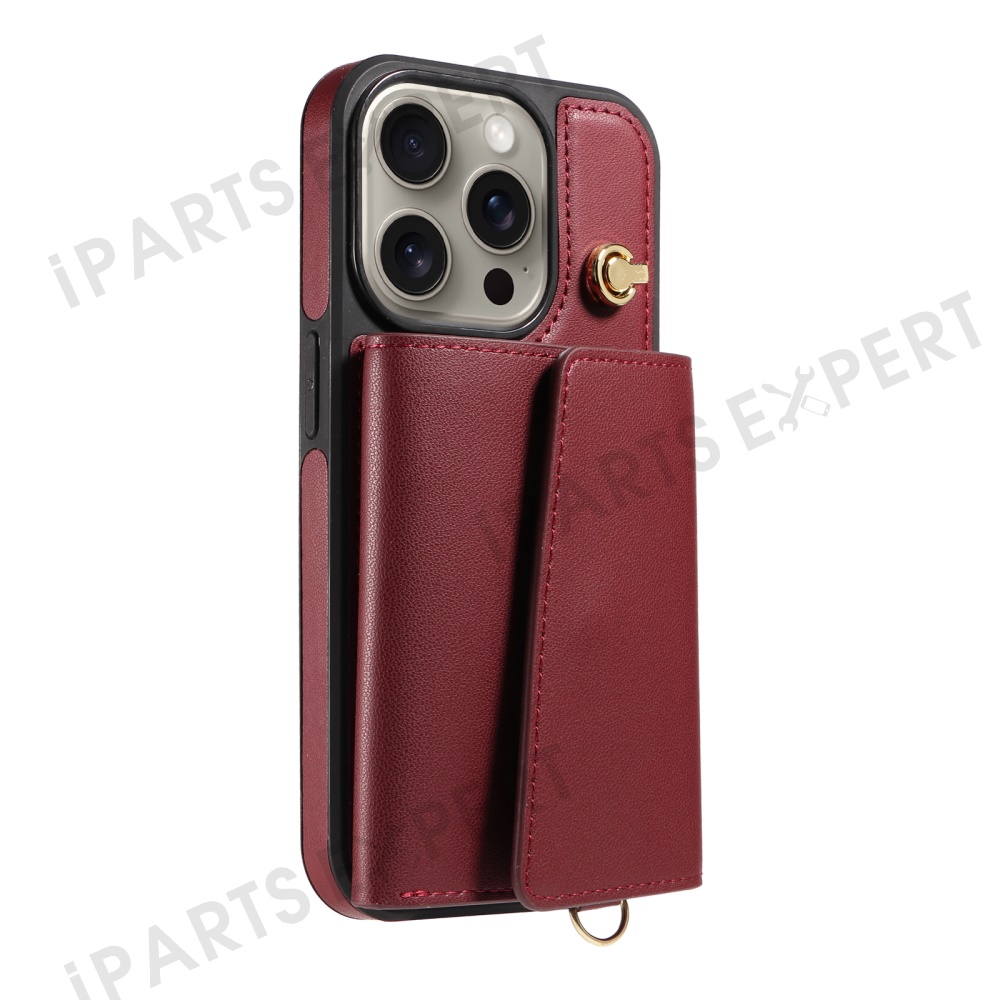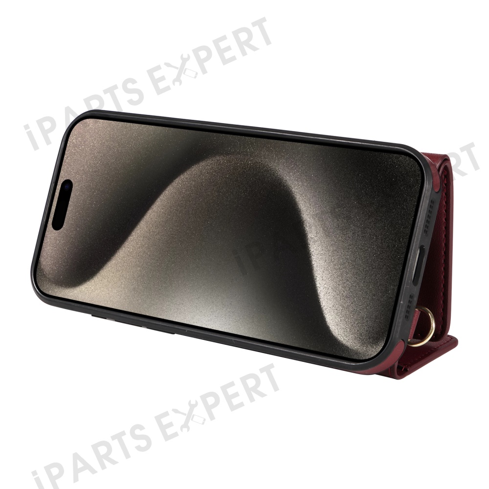 For iPhone 15 Pro Max Crossbody Phone Case Card Holder Kickstand Leather Coated TPU Mobile Cover - Wine Red