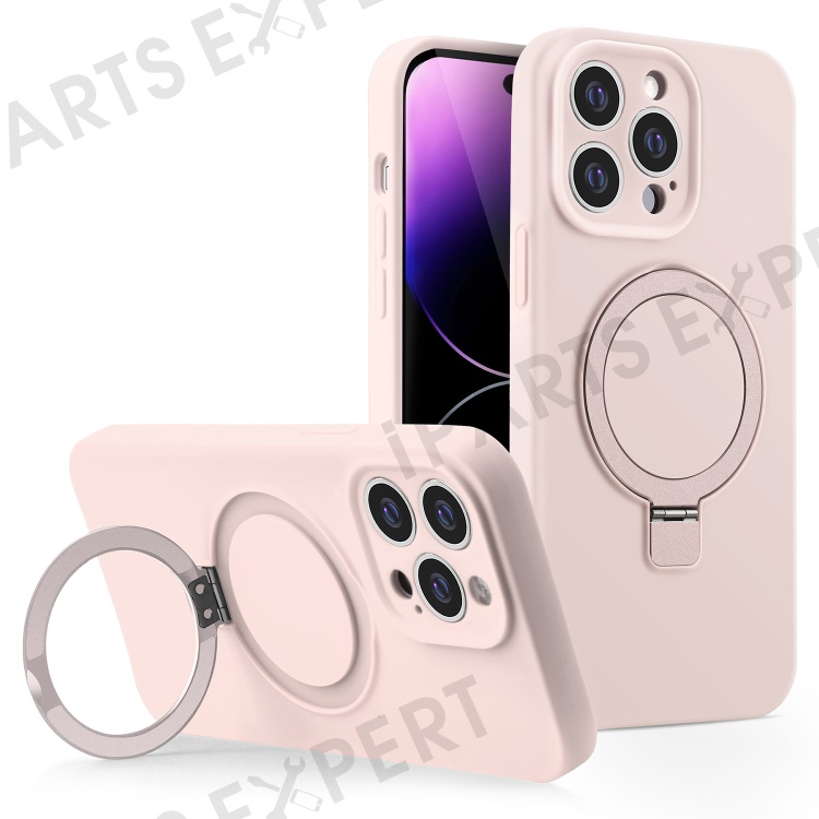 For iPhone 15 Pro Max Magnetic Case Liquid Silicone Phone Cover Ring Magnetic Kickstand - Pink