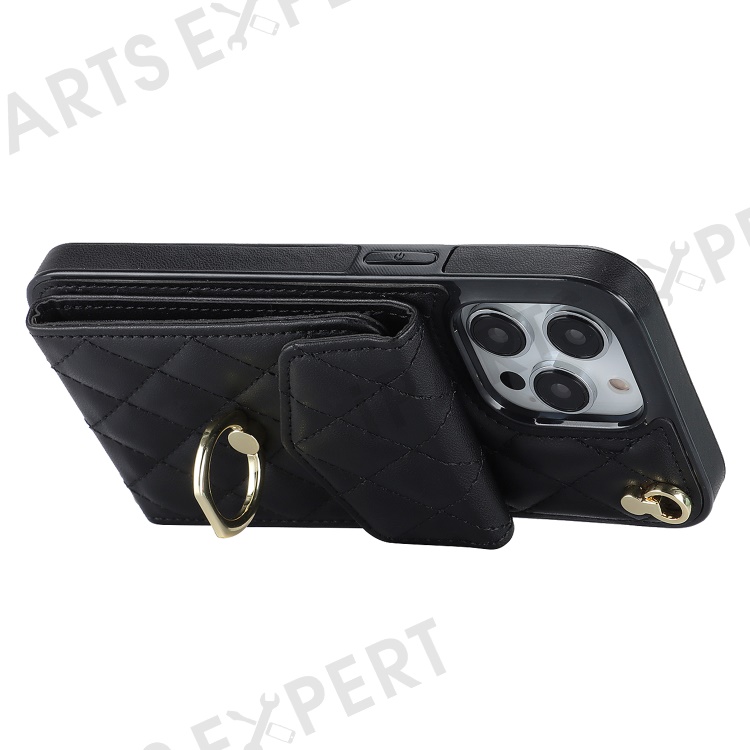 For iPhone 15 Pro Max RFID Blocking Shockproof Case Multiple Card Slots Ring Kickstand PU Leather+TPU Phone Cover - Black
