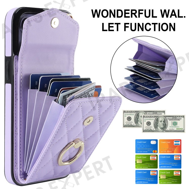For iPhone 15 Pro Max RFID Blocking Shockproof Case Multiple Card Slots Ring Kickstand PU Leather+TPU Phone Cover - Purple