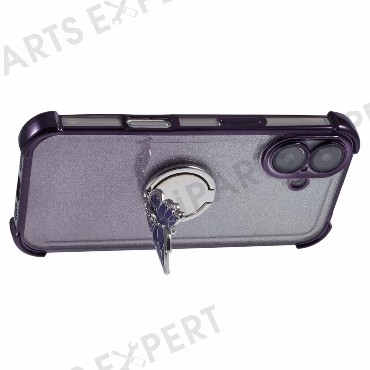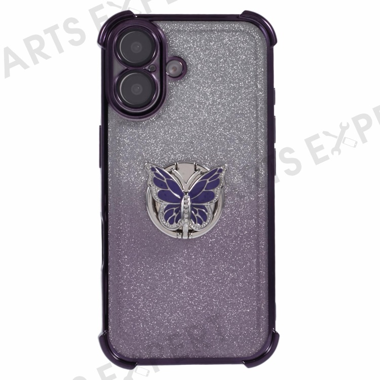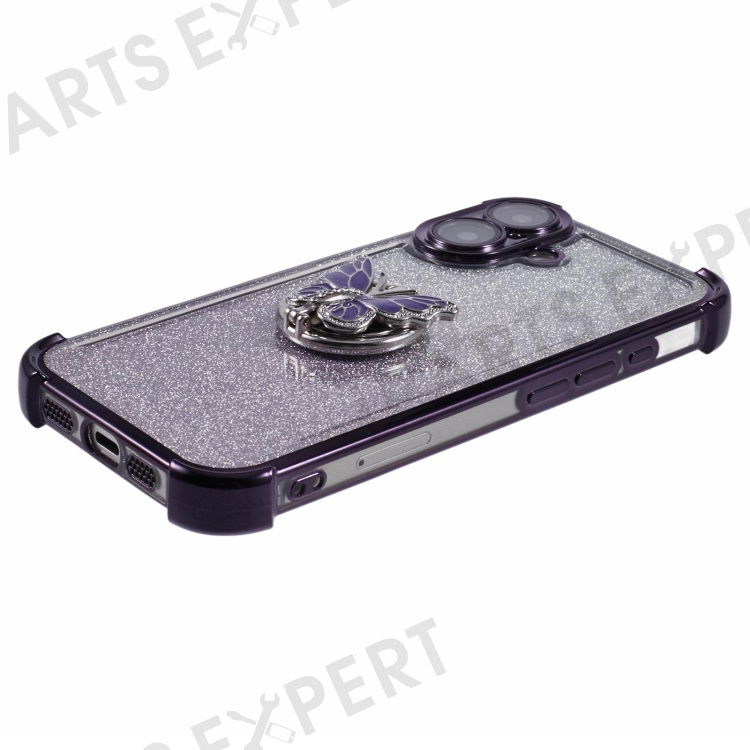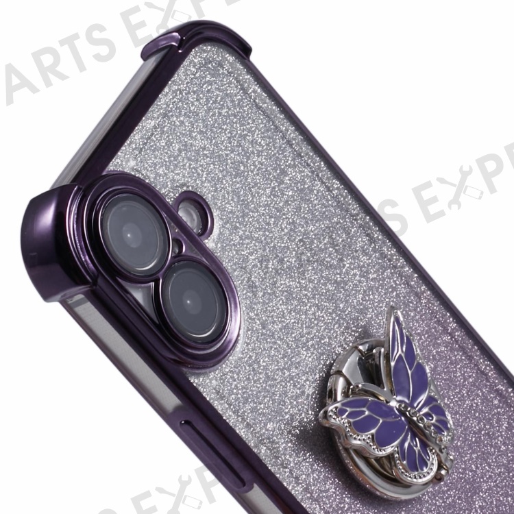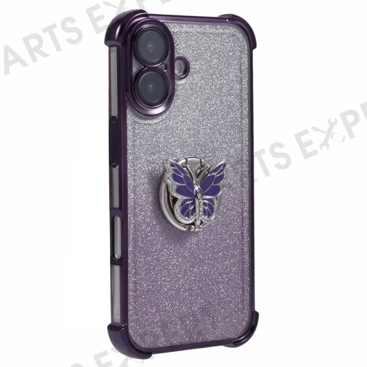 For iPhone 16 Case Butterfly Kickstand Glitter TPU Shockproof Phone Cover - Purple