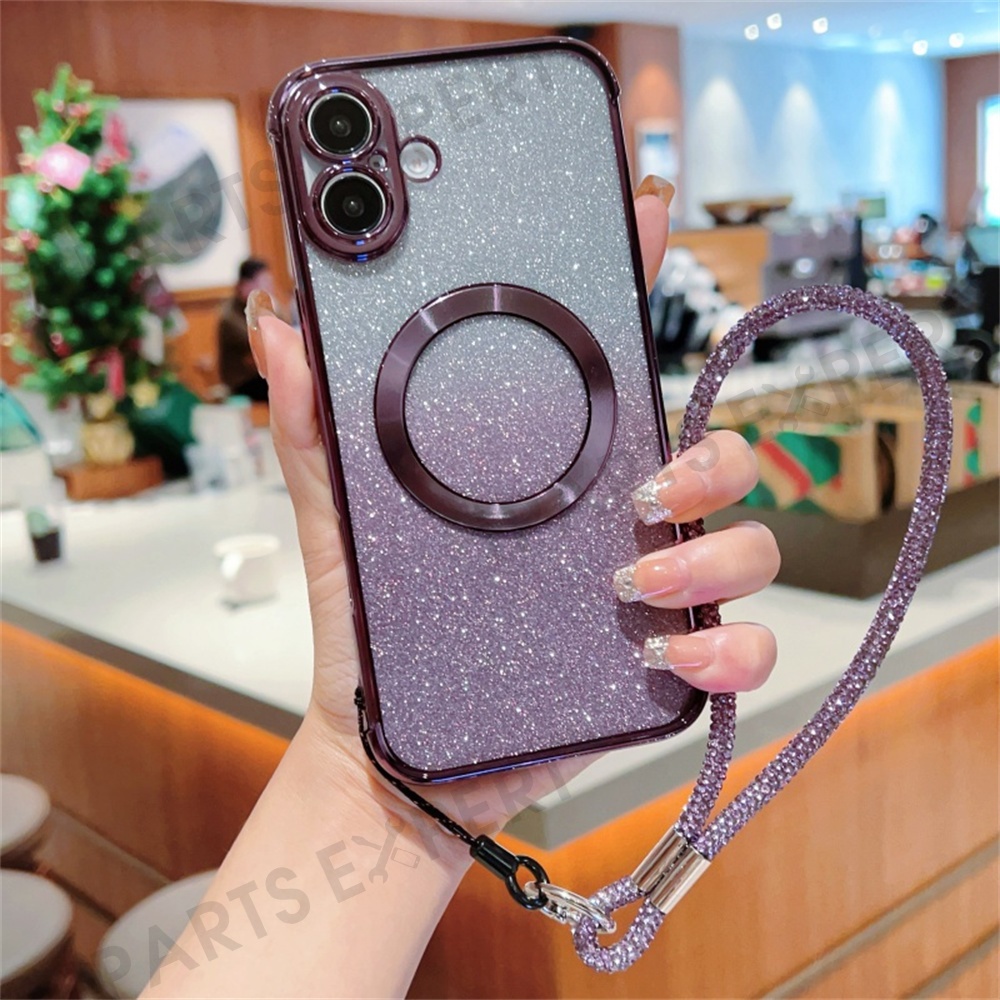 For iPhone 16 Case Compatible with MagSafe Electroplated Gradient Glitter Phone Cover with Lanyard - Dark Purple