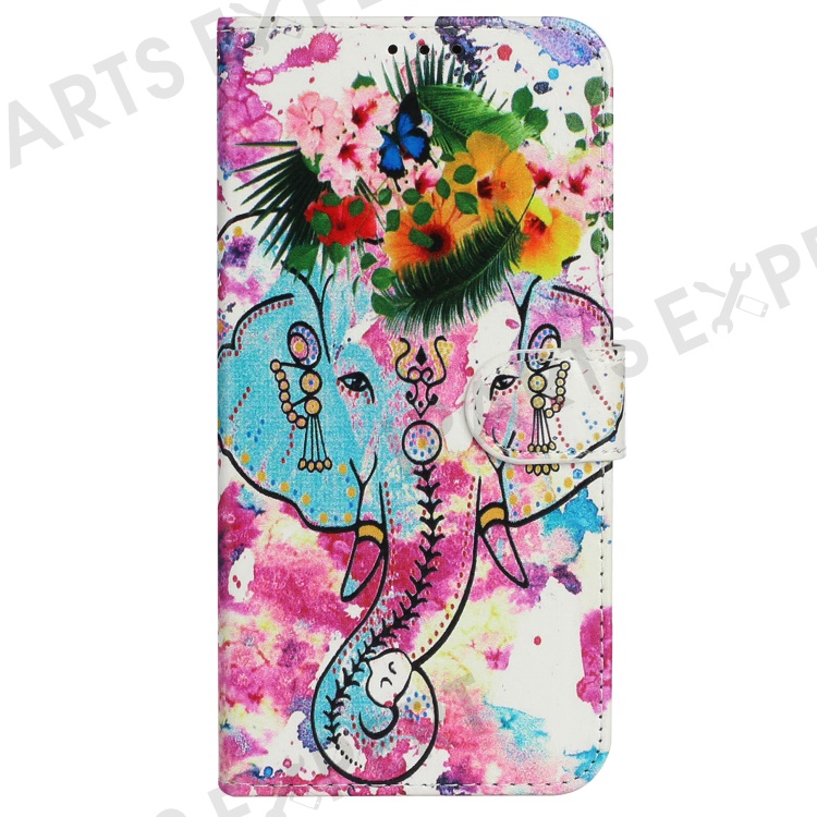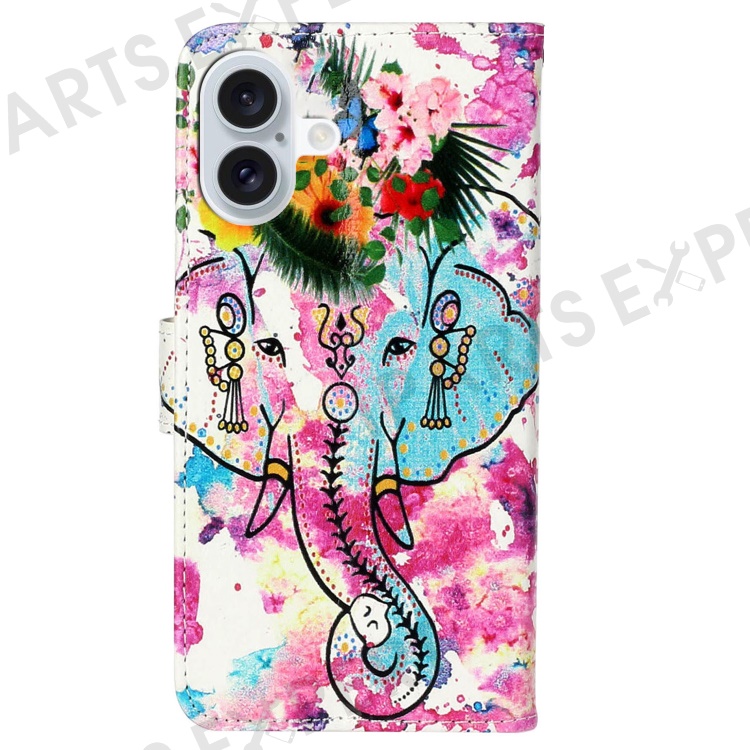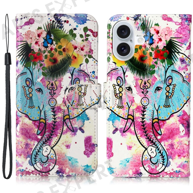 For iPhone 16 Case Leather Card Slot Holder Flip Phone Cover Pattern Printing - Flower Elephant