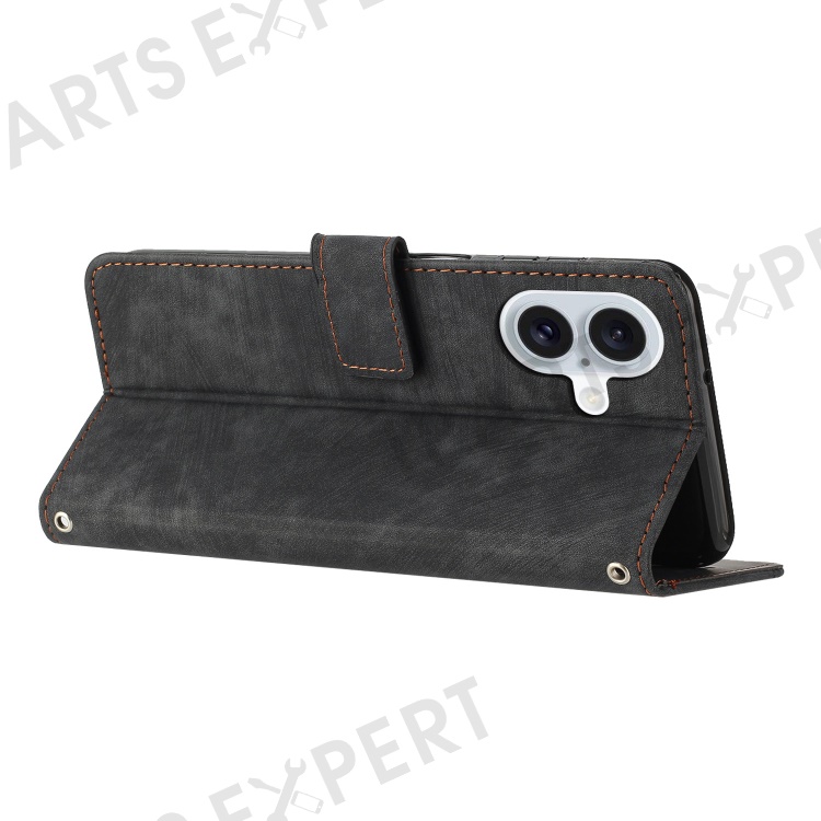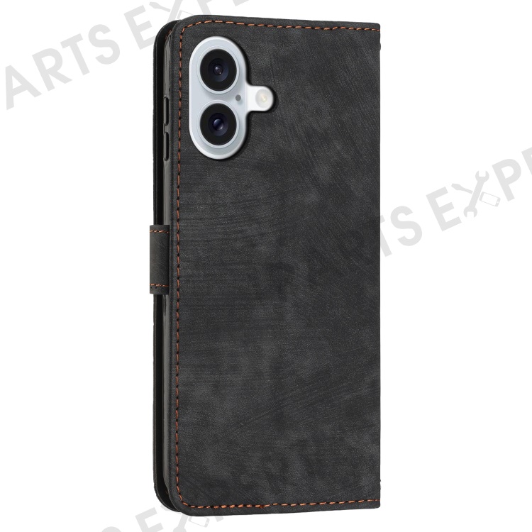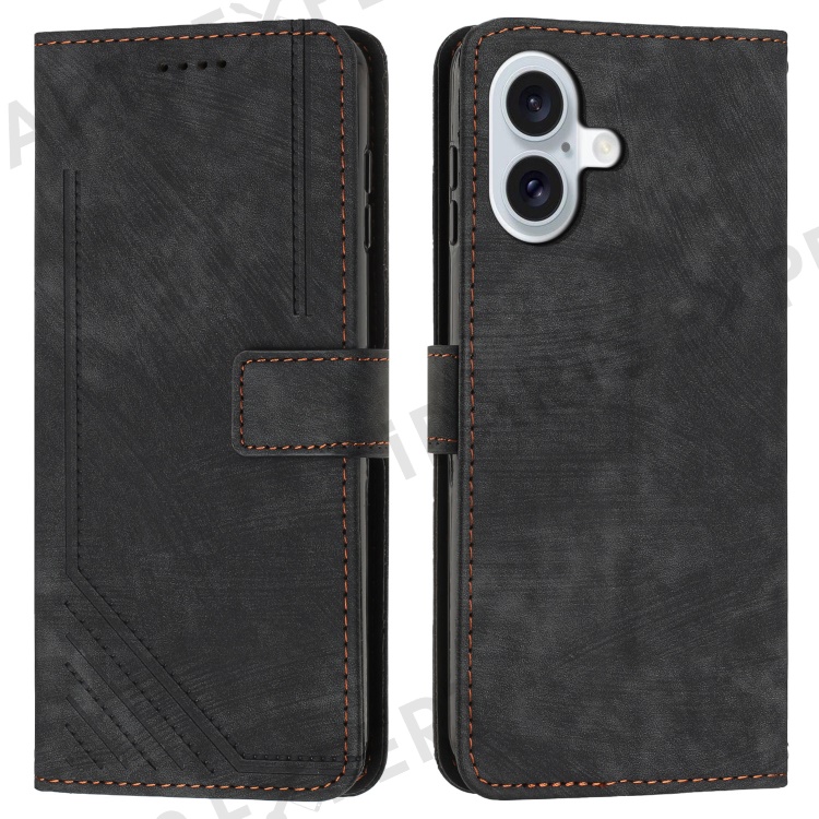 For iPhone 16 Case Lines Pattern Leather Phone Cover Card Holder Stand Wrist Strap - Black
