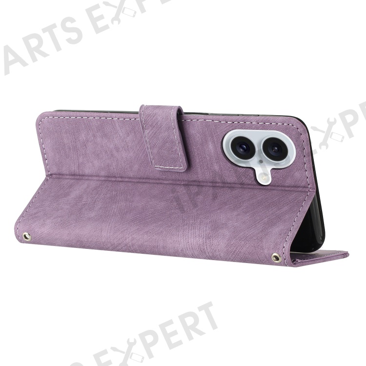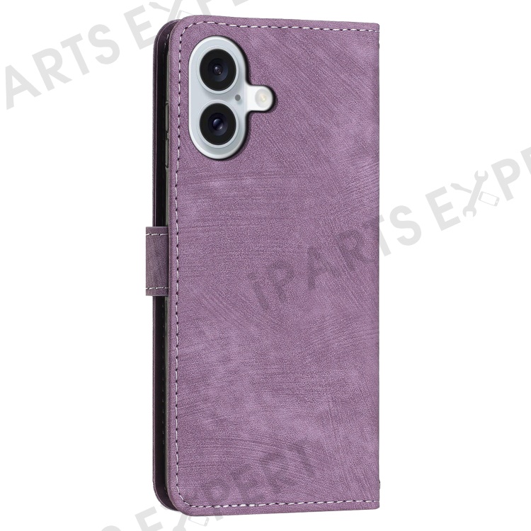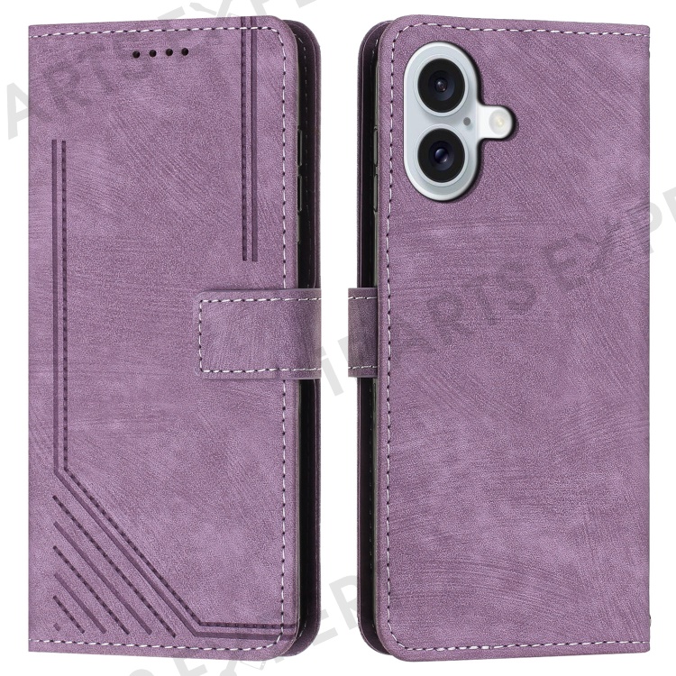 For iPhone 16 Case Lines Pattern Leather Phone Cover Card Holder Stand Wrist Strap - Purple