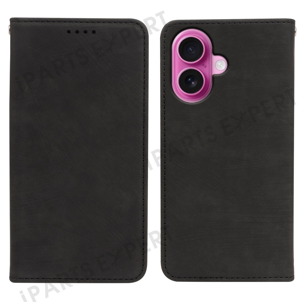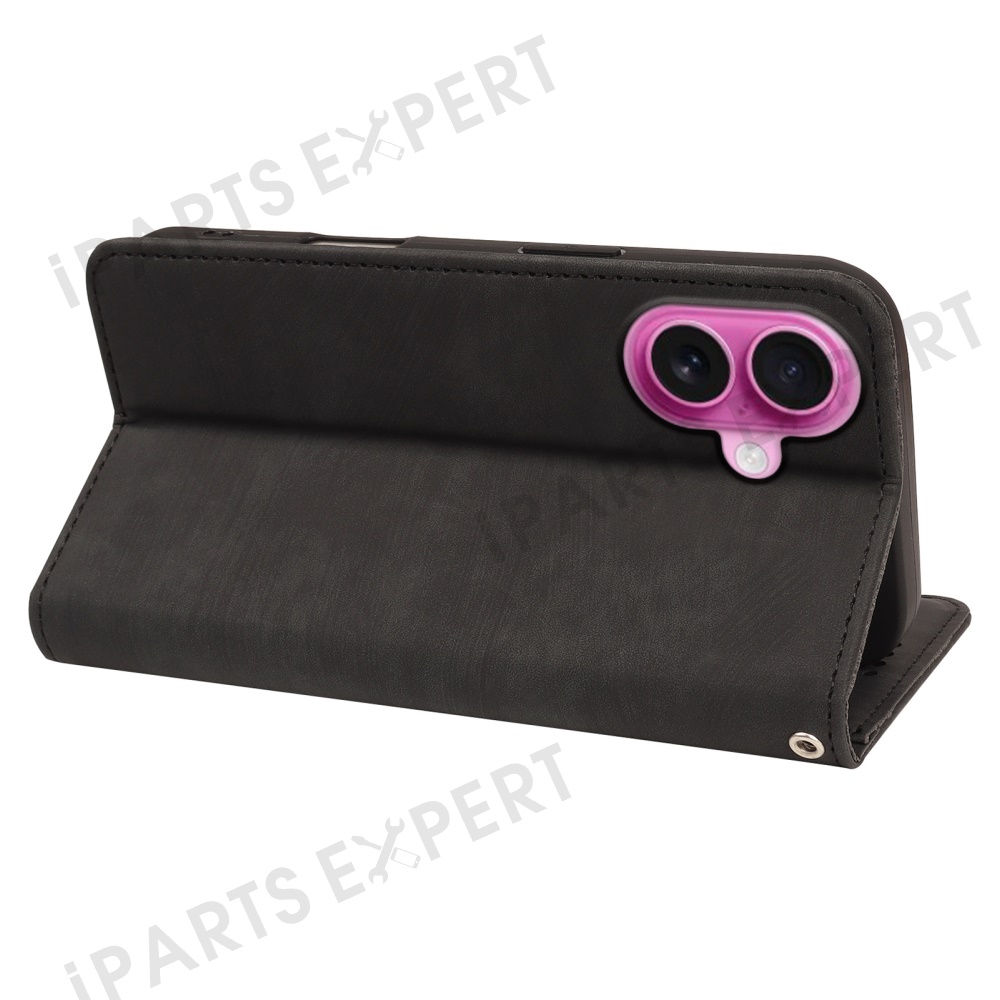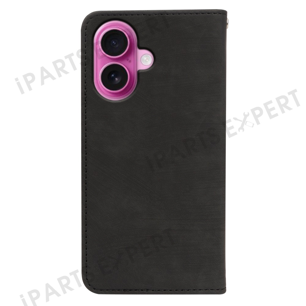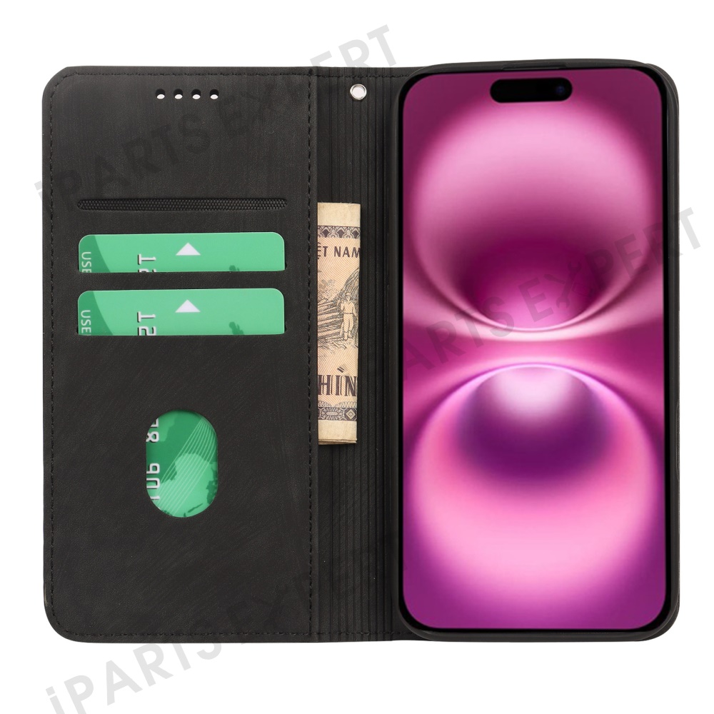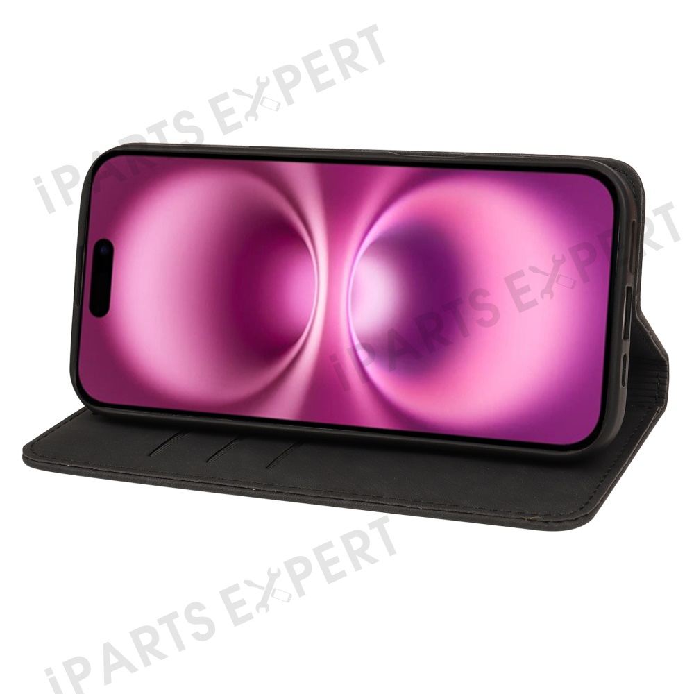 For iPhone 16 Case Strong Magnetic Leather Wallet Phone Cover with Striped Texture - Black