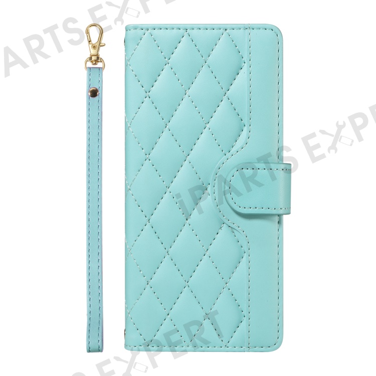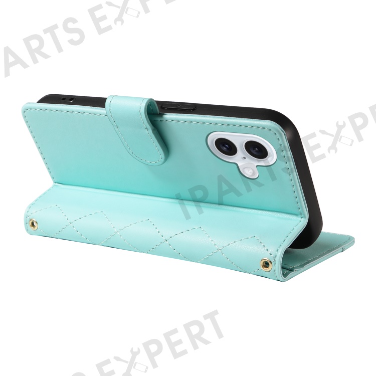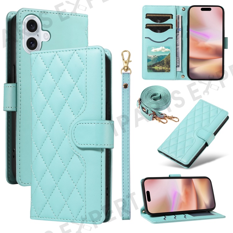 For iPhone 16 Case Wallet Quilted Leather Phone Cover with Shoulder Strap, Wrist Strap - Green
