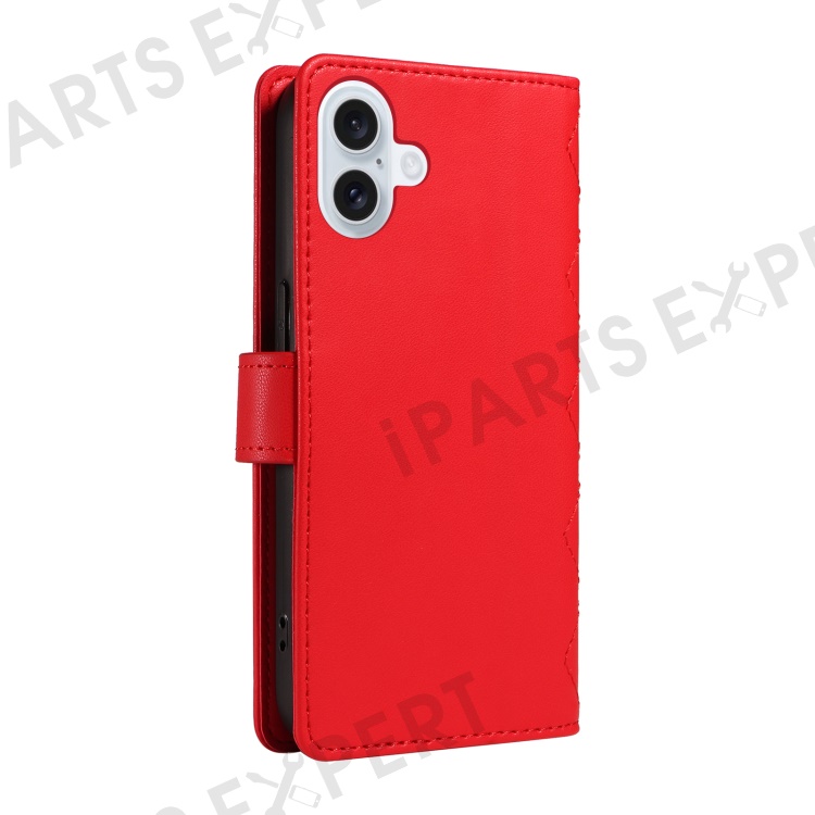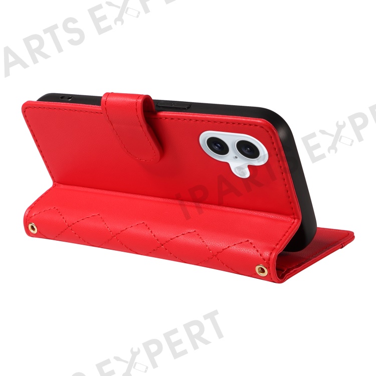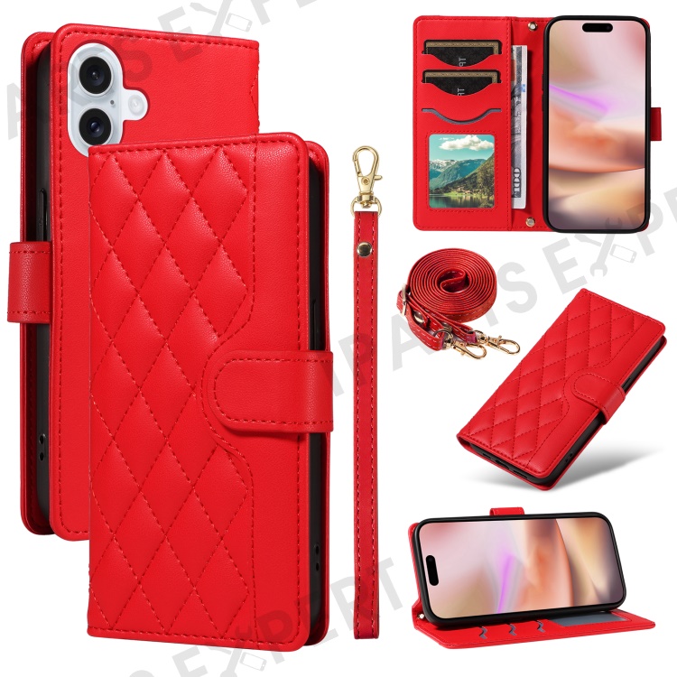 For iPhone 16 Case Wallet Quilted Leather Phone Cover with Shoulder Strap, Wrist Strap - Red