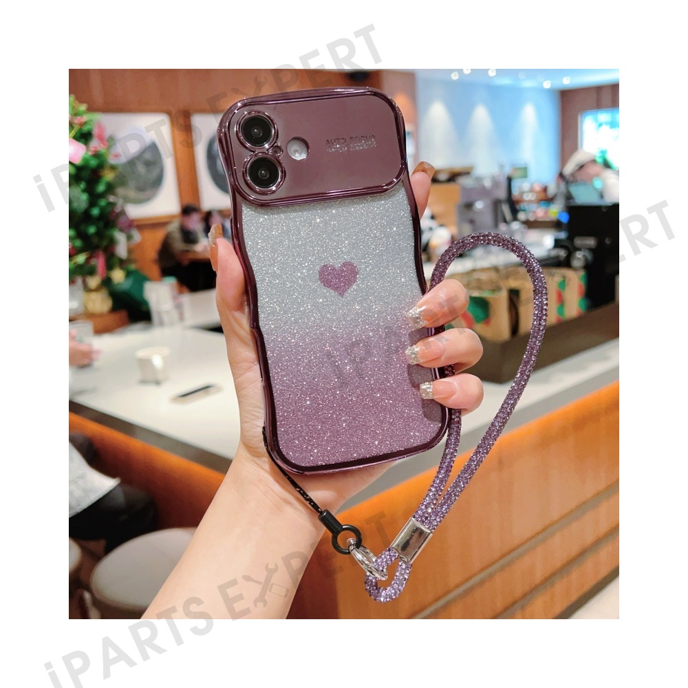 For iPhone 16 Case with Strap Electroplating TPU Phone Cover Love Heart Gradient Glitter - Dark Purple