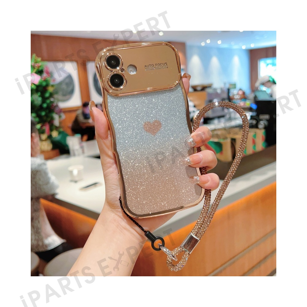 For iPhone 16 Case with Strap Electroplating TPU Phone Cover Love Heart Gradient Glitter - Gold