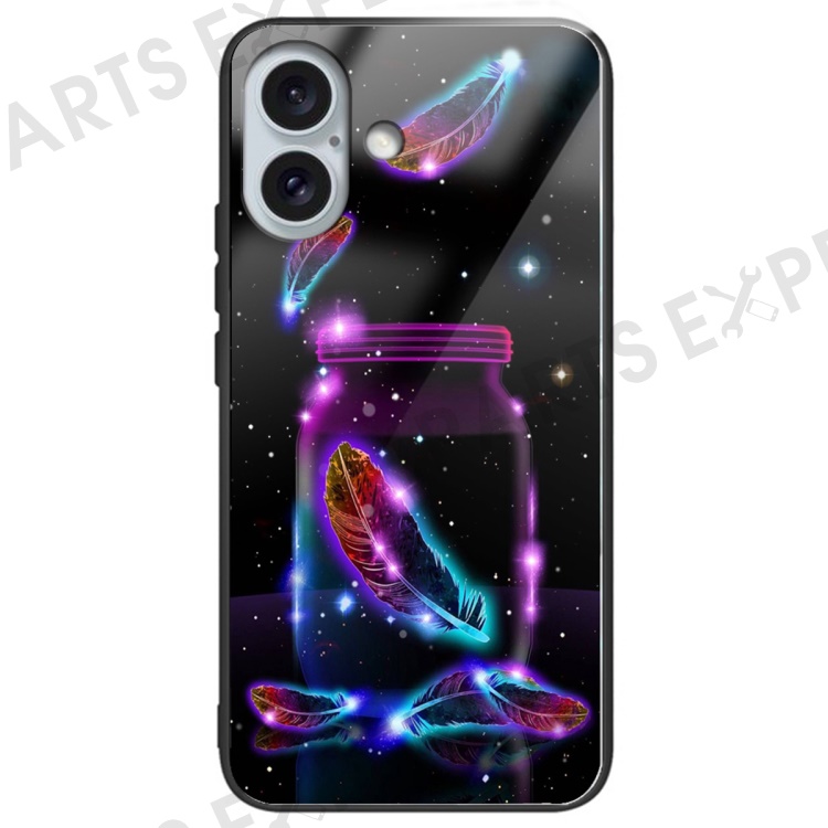For iPhone 16 Plus Case Pattern Printing Tempered Glass+TPU Phone Cover - Fluorescent Feather