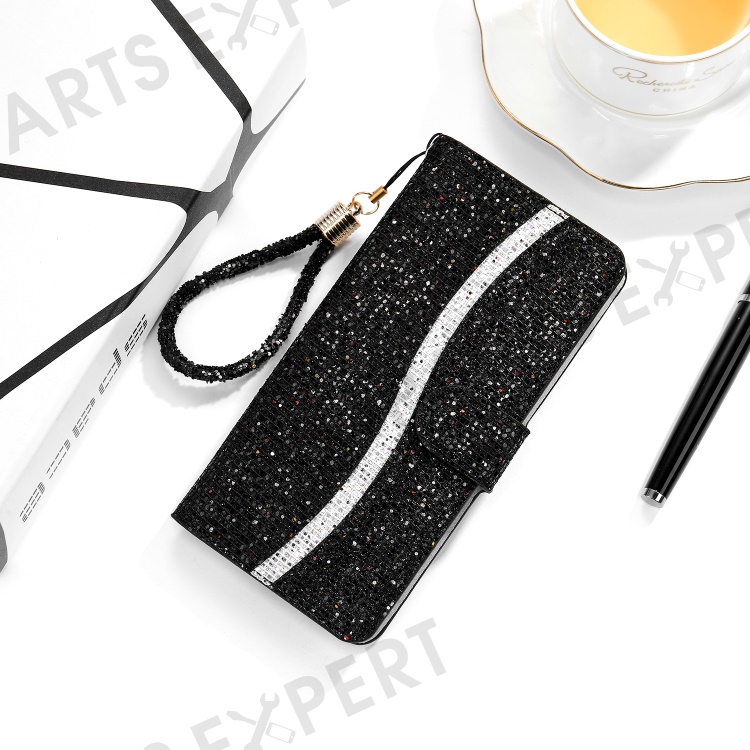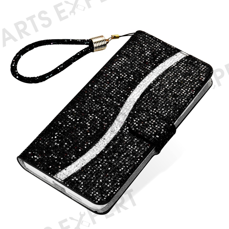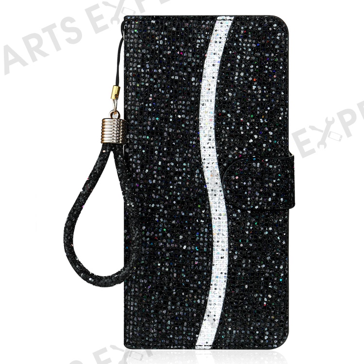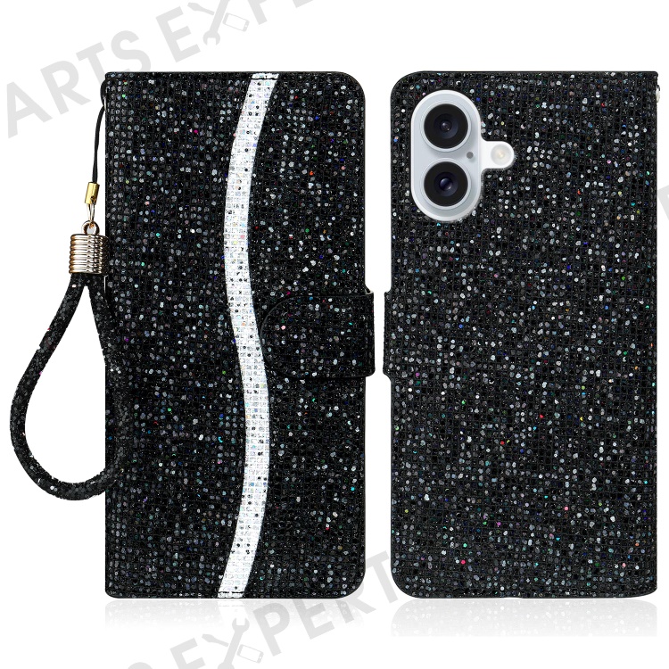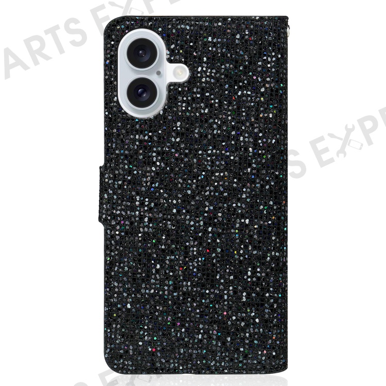 For iPhone 16 Plus Case PU Leather Wallet Card Slots Glitter Phone Cover - Black
