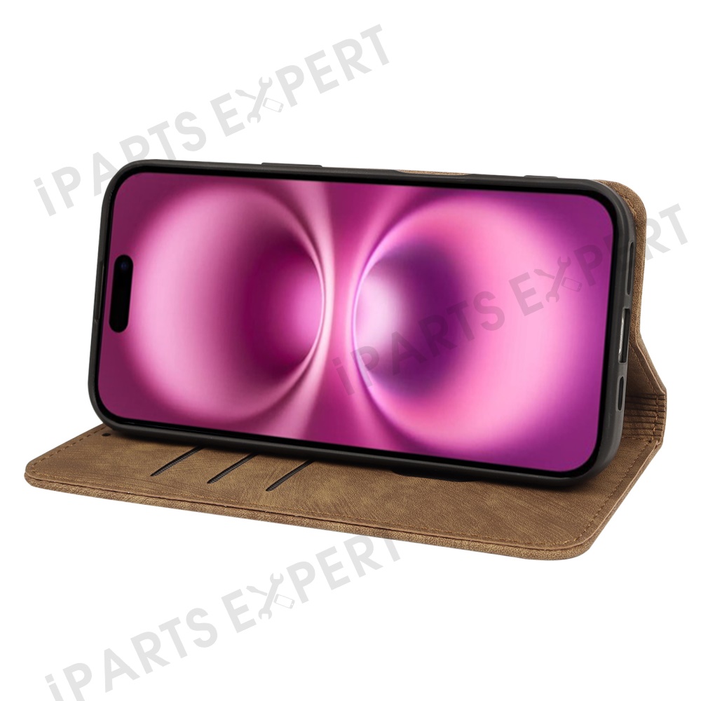 For iPhone 16 Plus Case Strong Magnetic Leather Wallet Phone Cover with Striped Texture - Brown