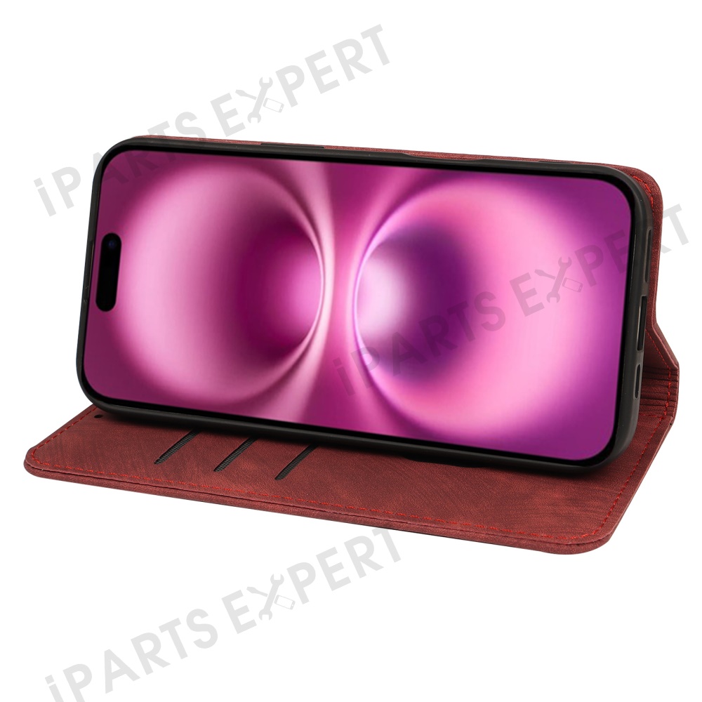 For iPhone 16 Plus Case Strong Magnetic Leather Wallet Phone Cover with Striped Texture - Red