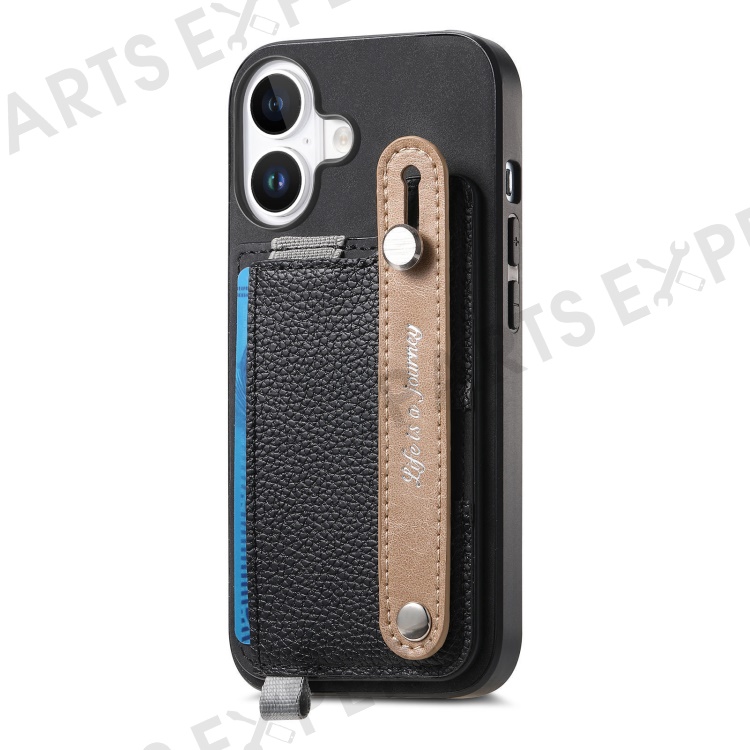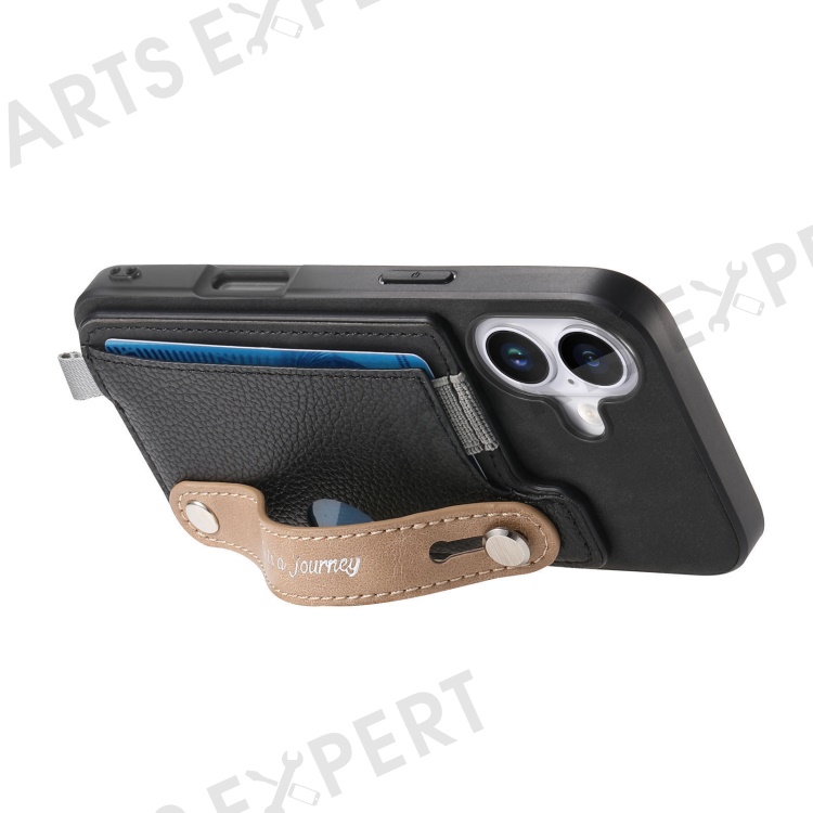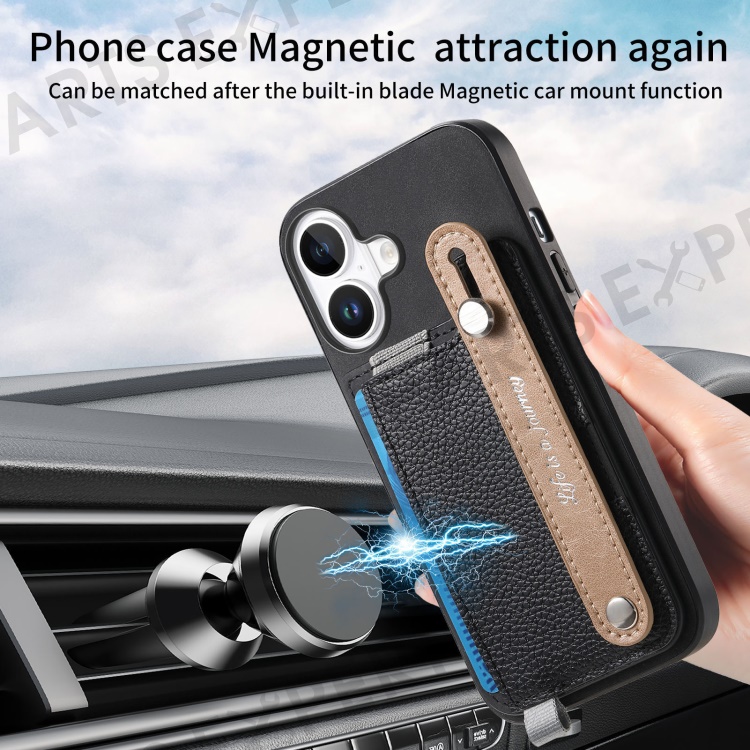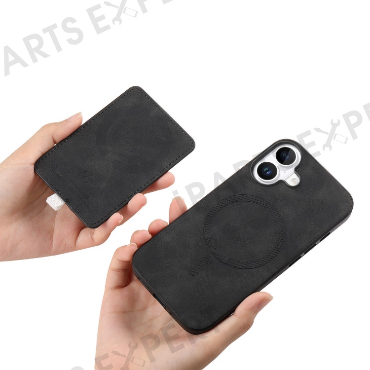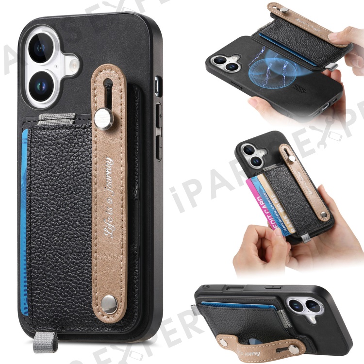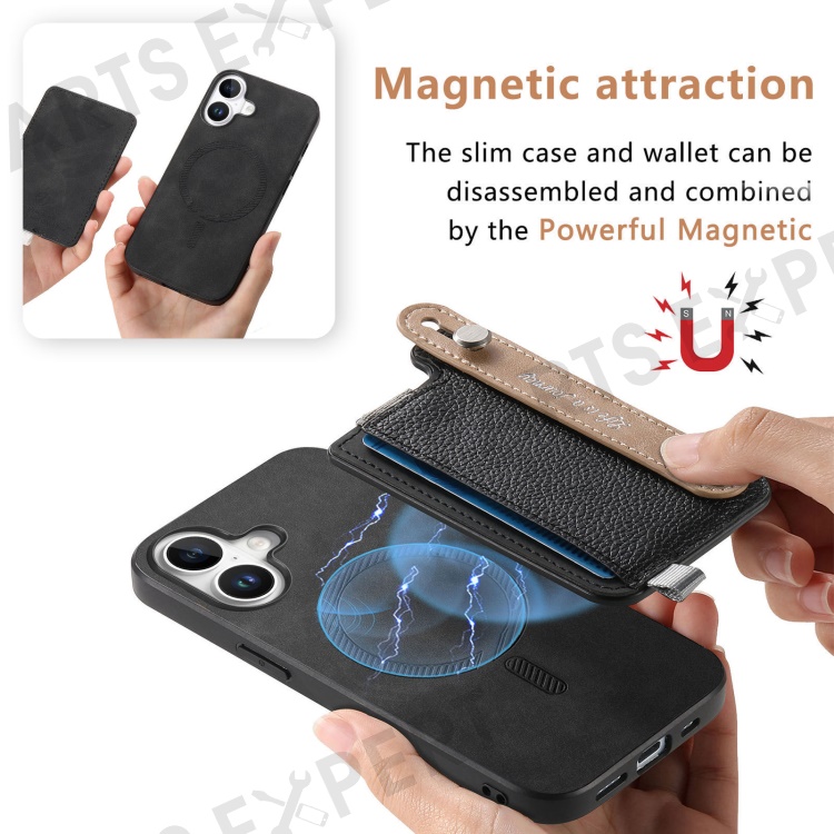For iPhone 16 Plus Magnetic Leather Back Case with Detachable Card Holder and Wristband - Black