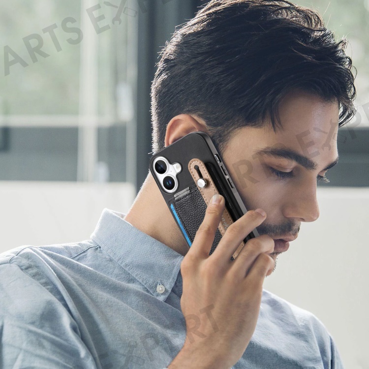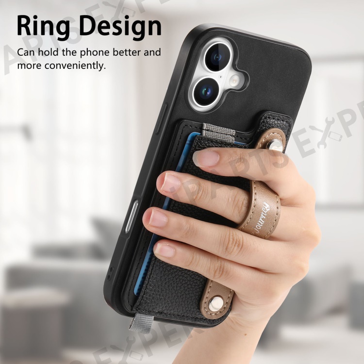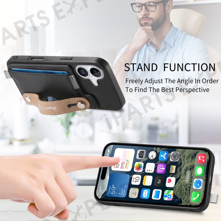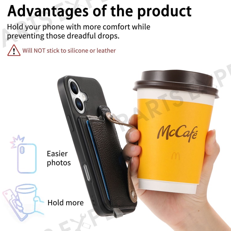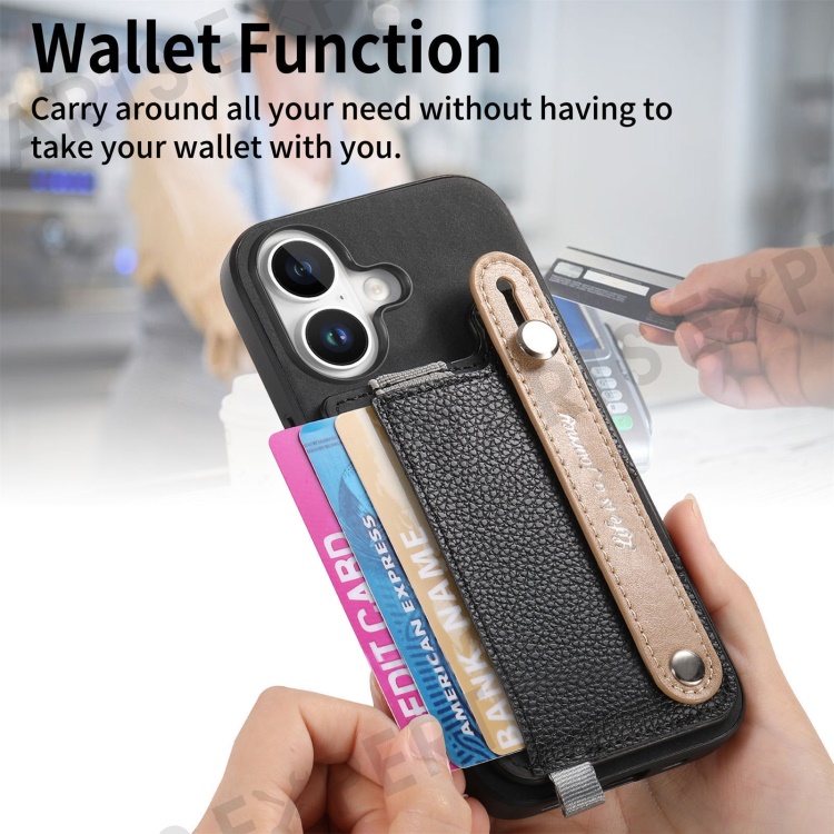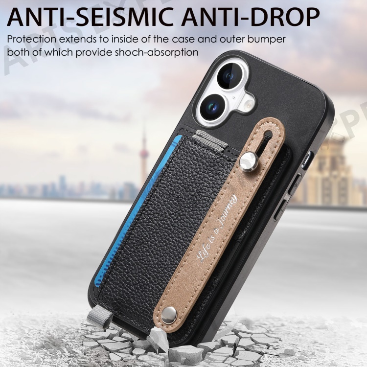 For iPhone 16 Plus Magnetic Leather Back Case with Detachable Card Holder and Wristband - Black
