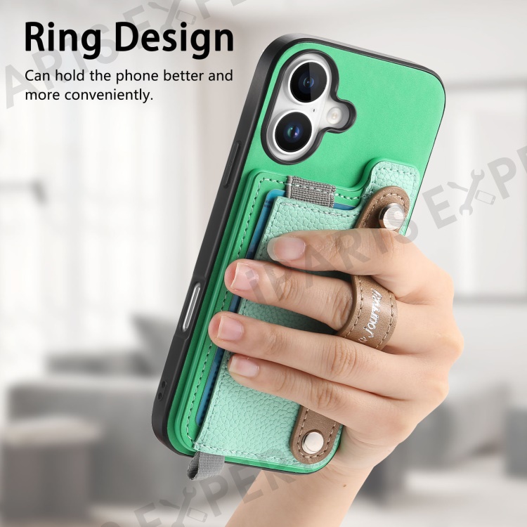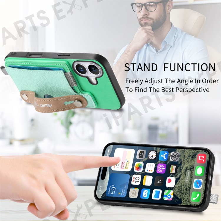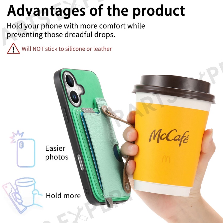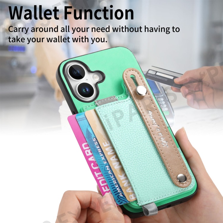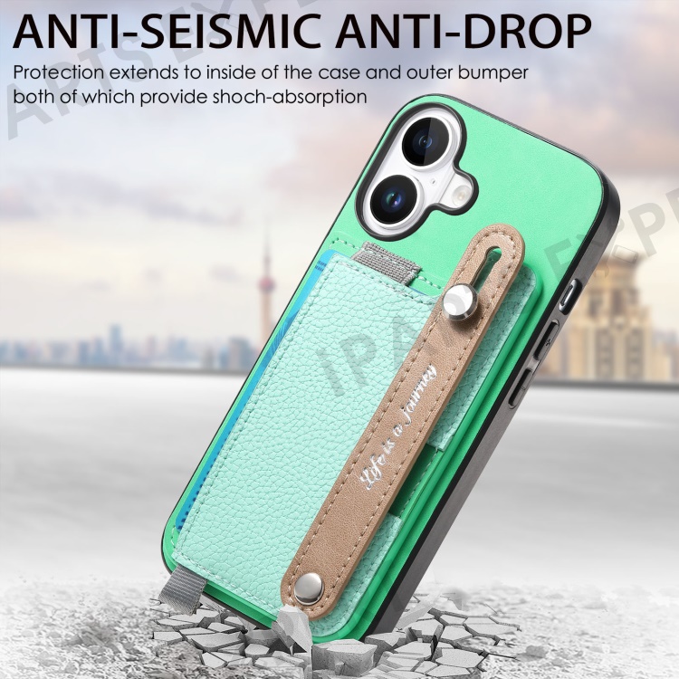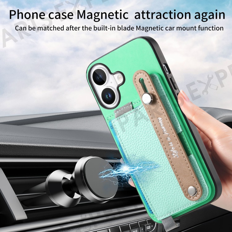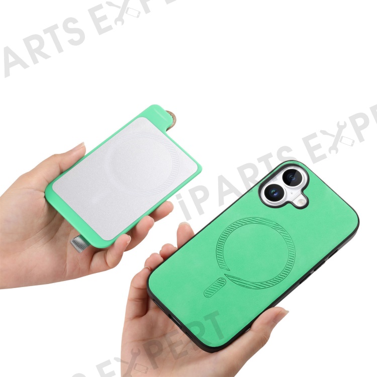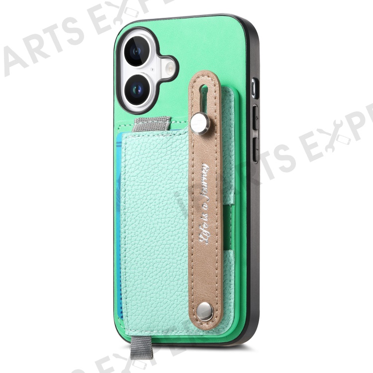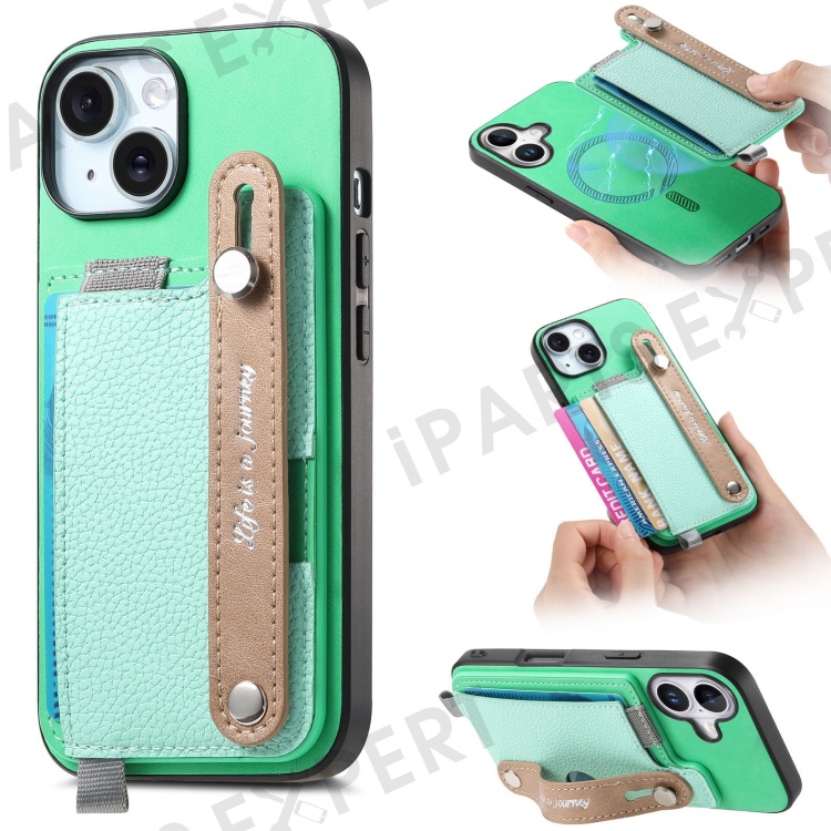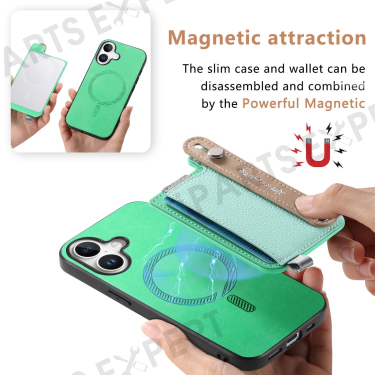 For iPhone 16 Plus Magnetic Leather Back Case with Detachable Card Holder and Wristband - Green