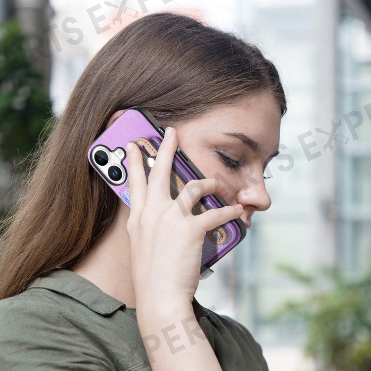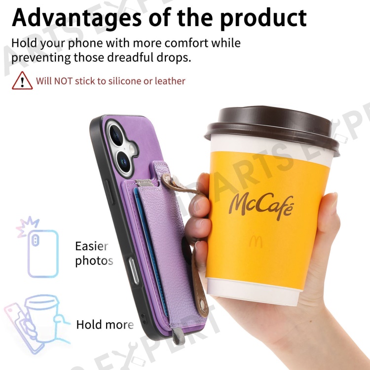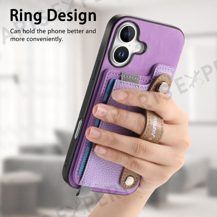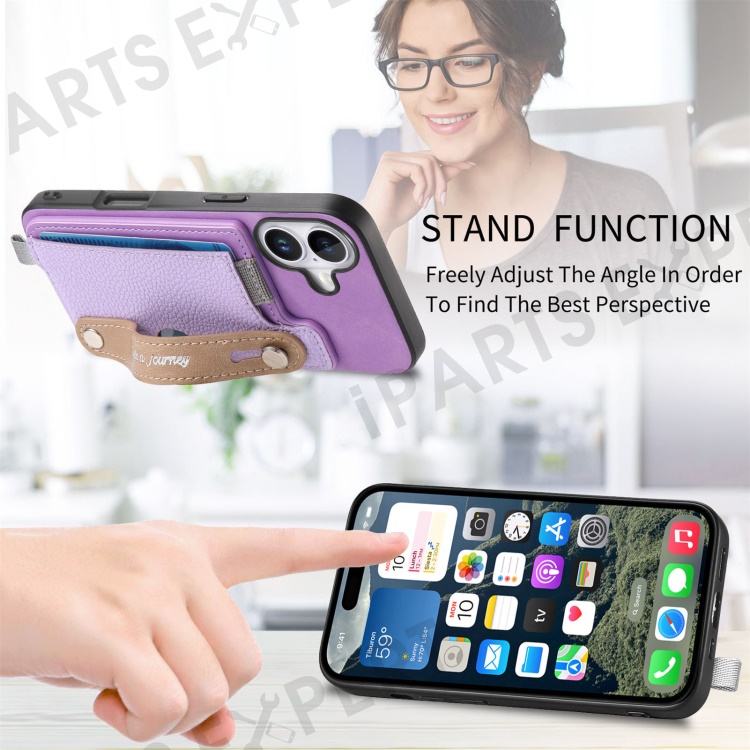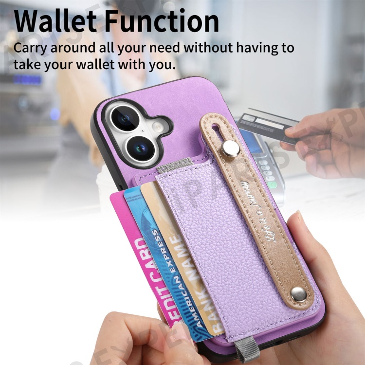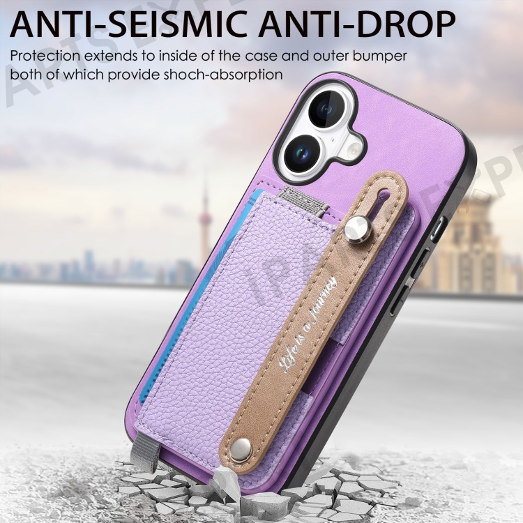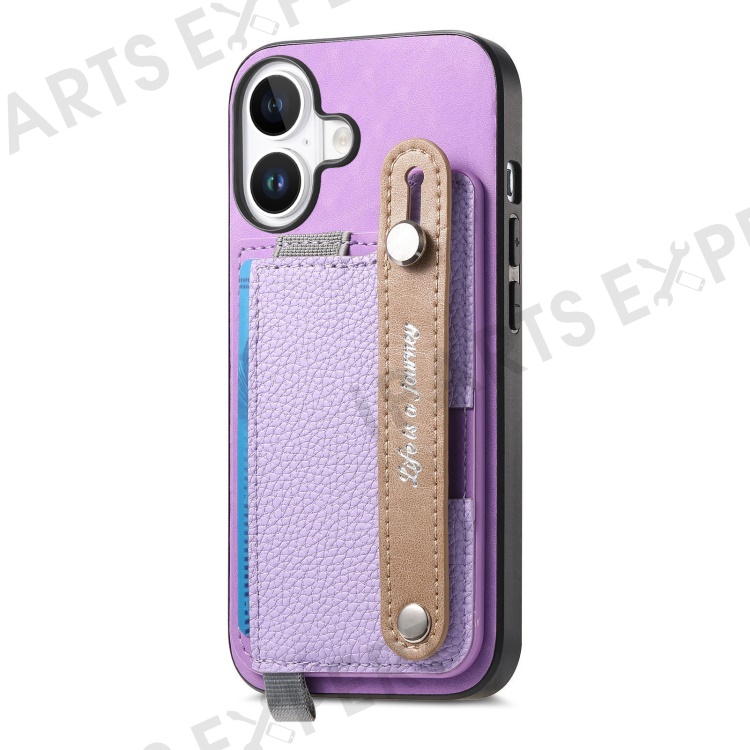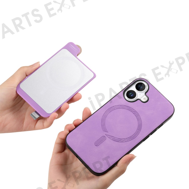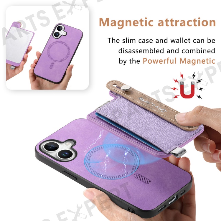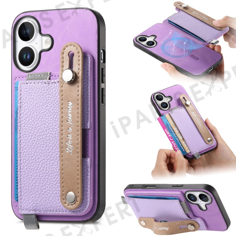 For iPhone 16 Plus Magnetic Leather Back Case with Detachable Card Holder and Wristband - Purple
