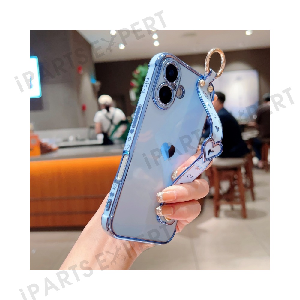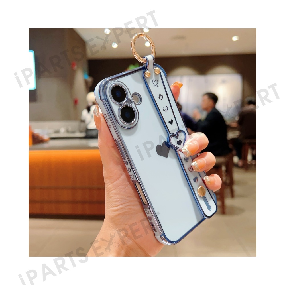 For iPhone 16 Plus Case Wristband Kickstand Love Heart TPU Phone Cover Finger Holder - Blue
